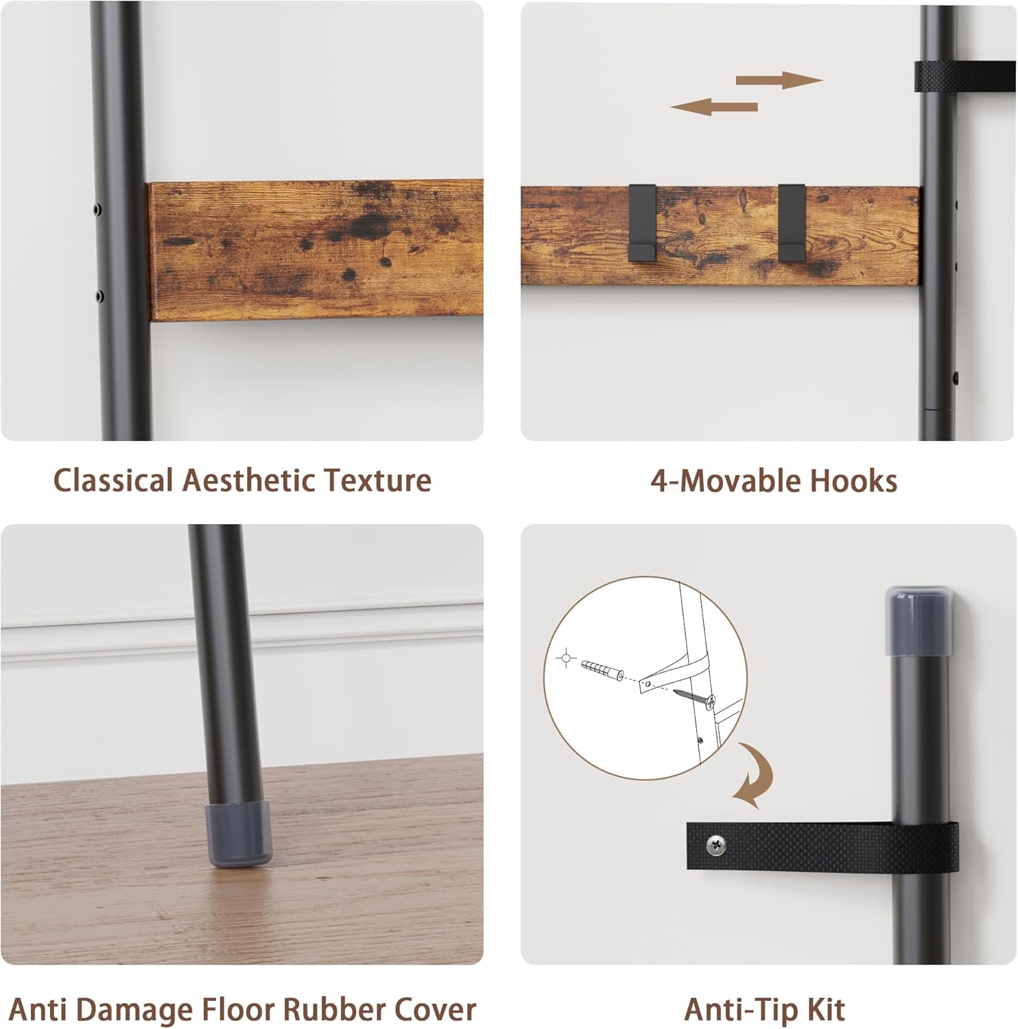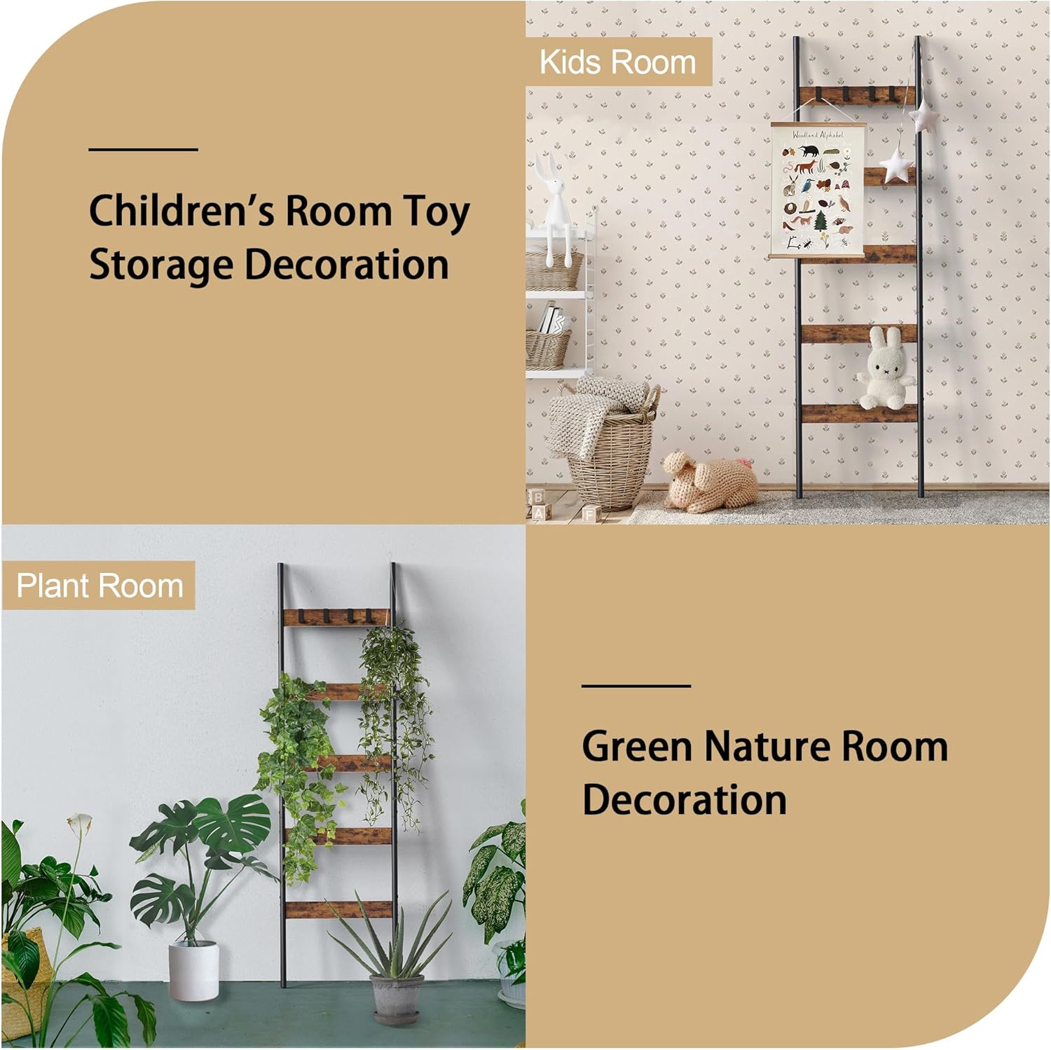 Blanket Ladder, 5-Tier Towel Holder with 4 Removable Hooks, Farmhouse Wall Leaning Decorative Rack Shelf, Wooden Towel Display Rack, Quilt Ladder for Living Room, Bedroom, Rustic Brown