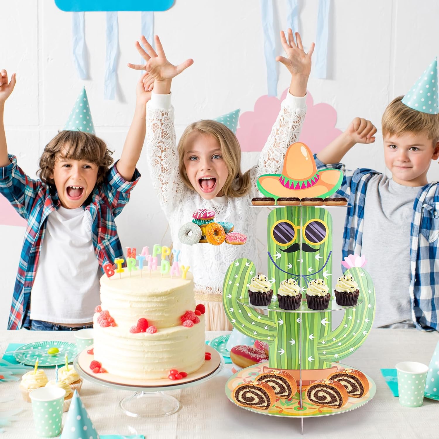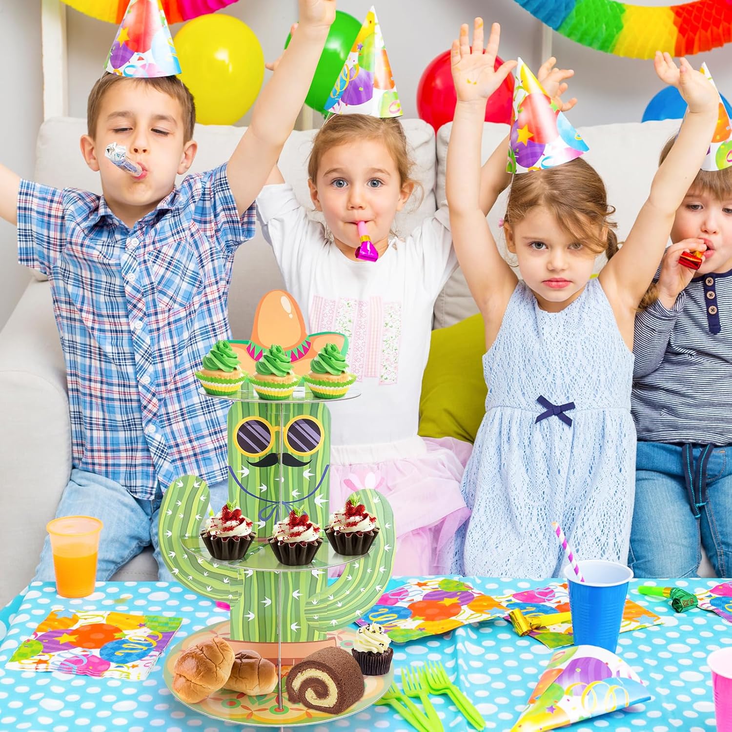 - The pattern on the cake stand is brightly colored, with green as the main color. The cartoon-style cactus image is wearing sunglasses and a bow tie, which is interesting and cute, adding a different joyful atmosphere to the party
