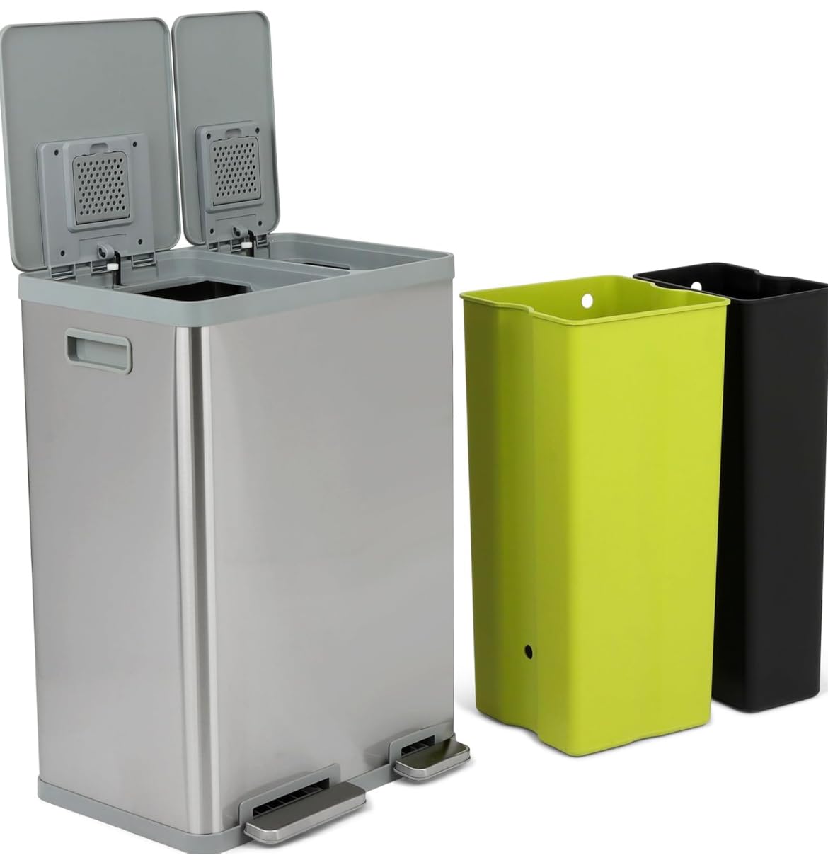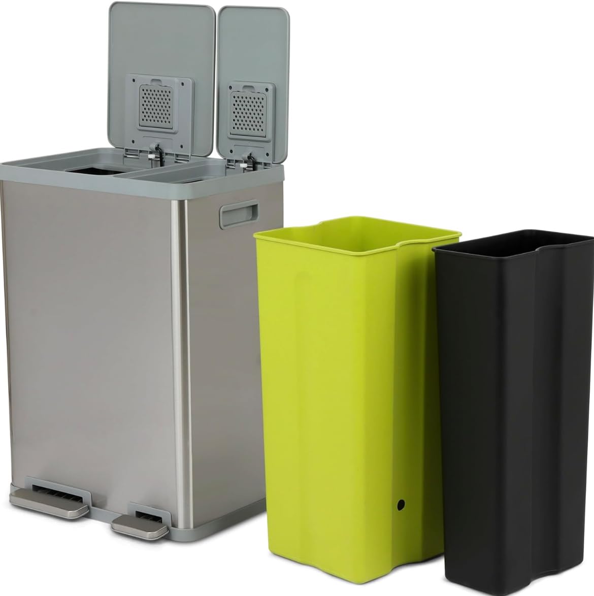 - HIGH CAPACITY WASTE AND RECYCLING SOLUTION: Color coded liners in Green (38L) and Black (22L) allow for easy sortation of waste and recycling, without sacrificing waste capacity, and fit standard liners using bag cinch.