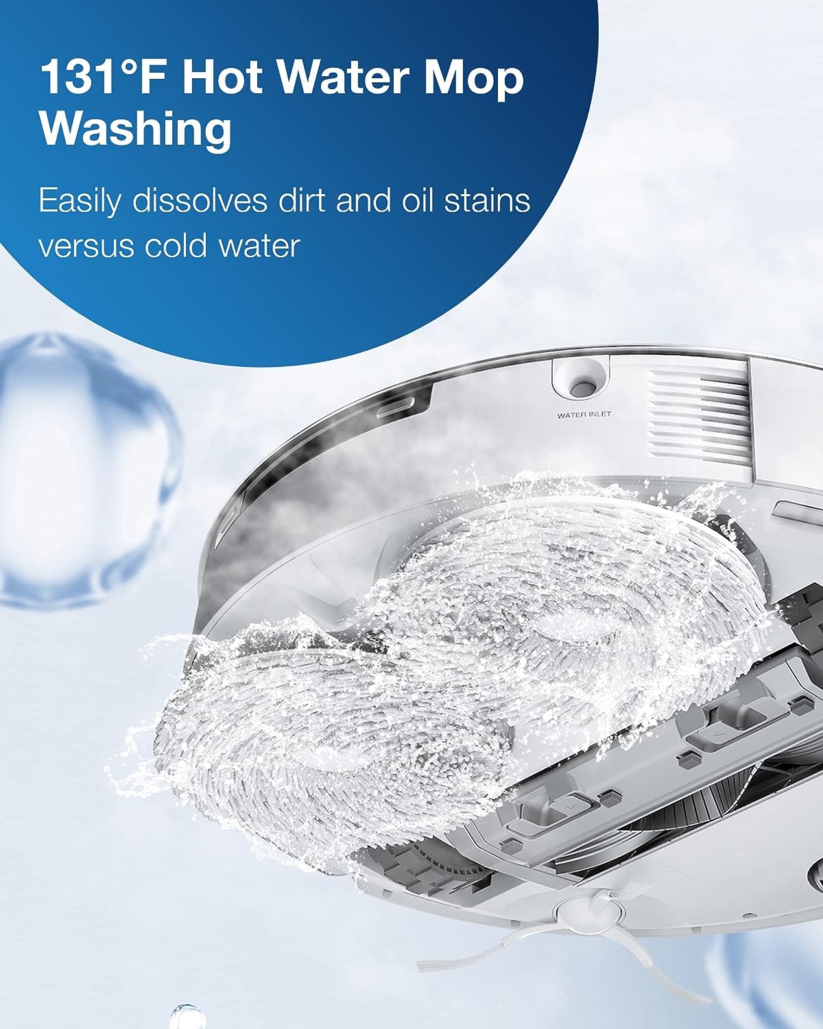 Industry's First Robot Vacuum and Mop Cleaner with Hot Water Mop Washing. T20 OMNI washes the mop with 131℉ hot water to dissolve oil and dirt and dries it with hot air. Bringing the heat to the cleaning game.