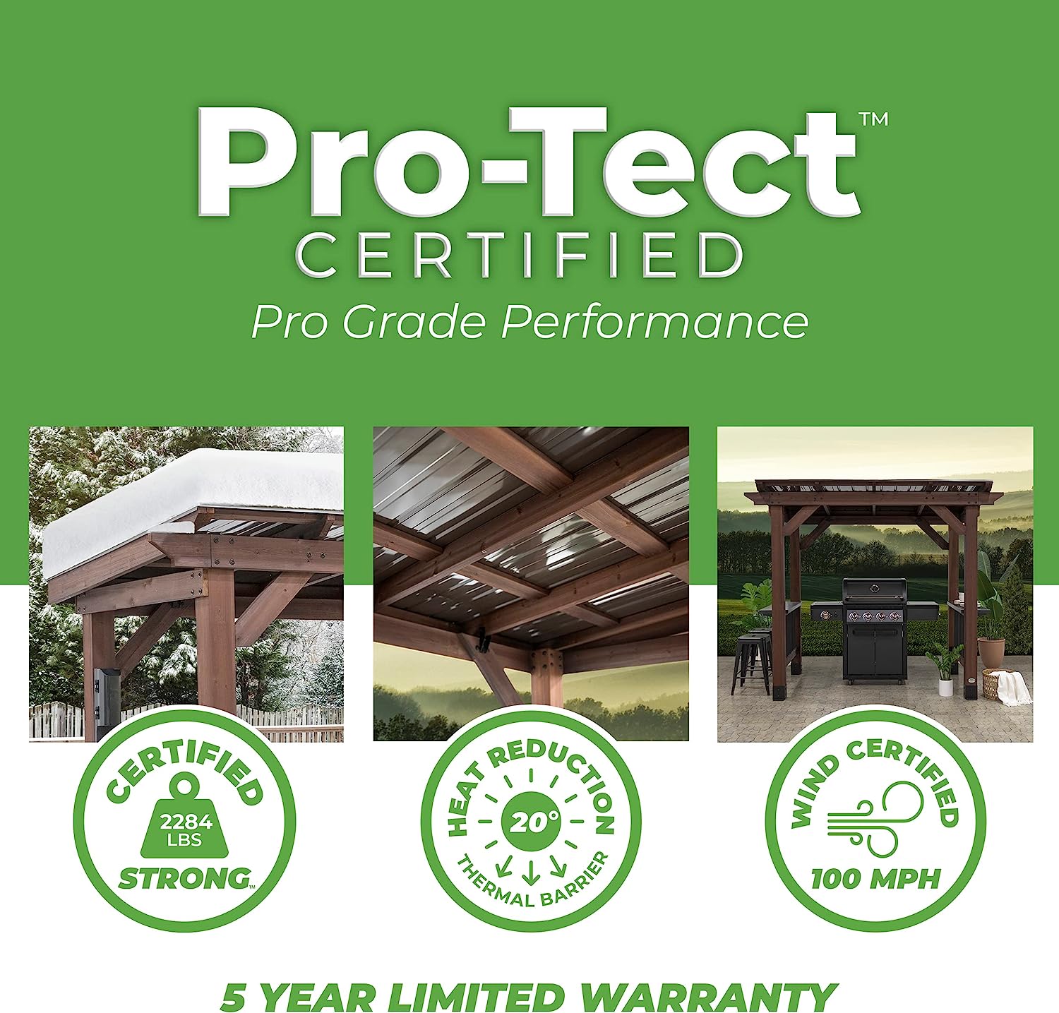 - Certified Strong: Pro-Tect certified performance structure; third party certified to withstand up to 2,284 pounds or 30 inches of snow load