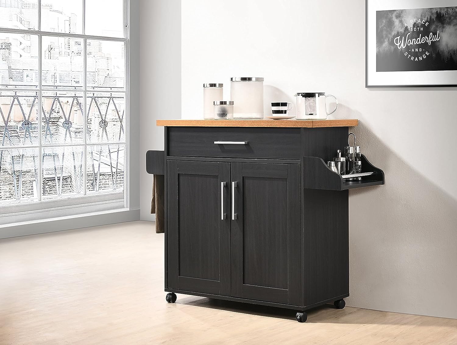 See listing for the product at Amazon here: https://www.amazon.com/Hodedah-HIK78-Black-Beech-Kitchen-Cart/dp/B079V76GHT