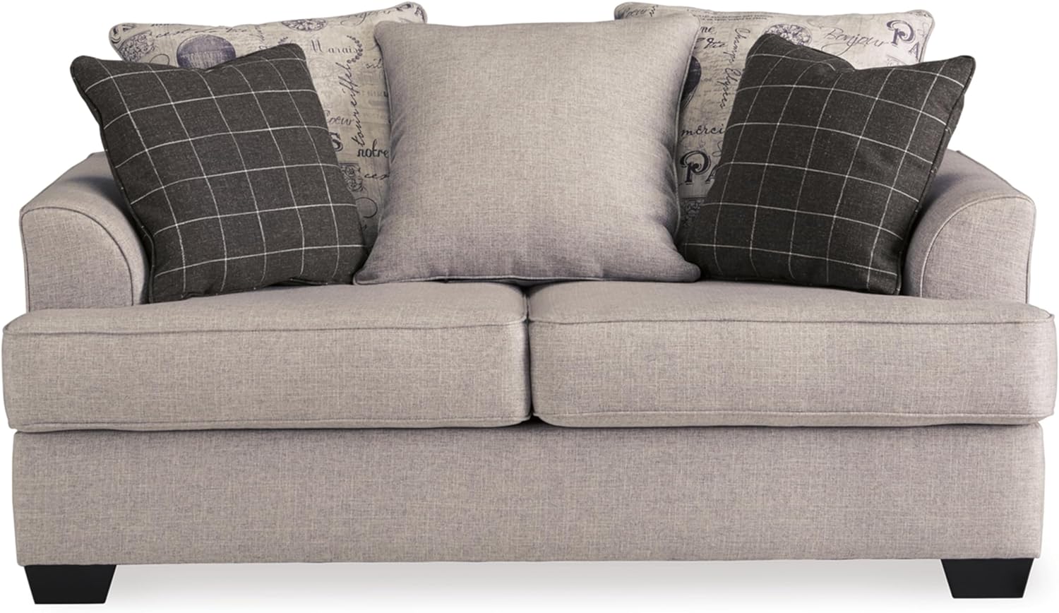 STYLISH LOVESEAT: Design enthusiasts, rejoice. This loveseat fulfills all of your wishes with its unique mix of back cushions and throw pillows, and with its luxuriously linen-like chenille upholstery, SUMPTUOUS COMFORT: Indulge on high-resiliency foam cushions wrapped in chenille-textured polyester upholstery. Supported by a sturdy corner blocked frame and exposed feet in a faux wood finish, SOFT NEUTRAL: Dressed up in a soothing pewter hue, this loveseat serves as a cornerstone of style in your living room space. Throw pillows with feminine scroll and plaid patterns add a chic touch, PERFECT SOFA COMPANION: Measuring 69" W x 40" D x 40" H, this loveseat pairs so well with a couch or accent chair set, ARRIVES ASSEMBLED: Ready for instant enjoyment. Fits through doorways 36" or wider