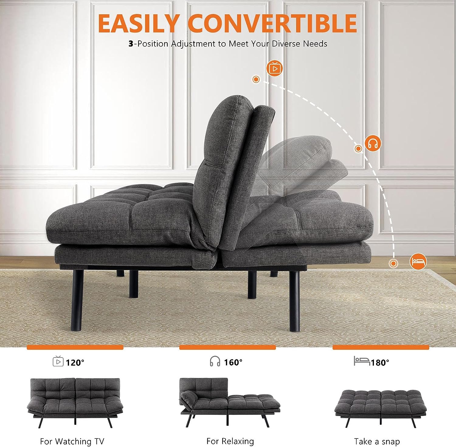 Multi-Functional Futon Sofa -With dimensions of 71" L x 31.5" W x 33" H as a sofa and 71" L x 42" W x 16" H as a sleeper bed, effortlessly adapt to your ever-changing needs. Seamlessly transition between a luxurious sofa and a comfortable bed, allowing you to make the most of your space. Its versatile nature makes it ideal for a range of settings, including apartments, dormitories, guest rooms, and offices., Adjustable Sofa Bed - The back of the futon couch bed has 3 angles to 120 °/160 °/180 °. The armrest can also be adjusted at three angles. Experience the pinnacle of comfort and flexibility with our adjustable. Designed with both adjustable backrest and armrests, you can effortlessly customize the seating position to suit your preferences., Sturdy Construction - Our futon sofa bed is built to withstand the test of time, thanks to its sturdy construction. Equipped with six chrome-plated metal legs, it offers exceptional support and stability. The inclusion of protective washers not only safeguards your floor but also adds to its longevity. Boasting an impressive weight capacity of up to 600 lbs, this sofa bed can easily handle daily use without compromising on its stability and durability., Unparalleled Comfort - Indulge in luxurious comfort as you sink into our futon sofa bed's plush cushioning. Crafted with high-density foam, it offers unparalleled support for your back, neck, and legs, ensuring optimal comfort throughout the day., Easy Assembly - With clear instructions, setting up your futon sofa bed is a breeze. Spend less time on installation and more time enjoying its ultimate comfort and functionality. Also, the sleek and modern design easily complements any interior style, from contemporary to minimalist. Elevate the ambiance of your living room, bedroom, or office, transforming it into a stylish haven.