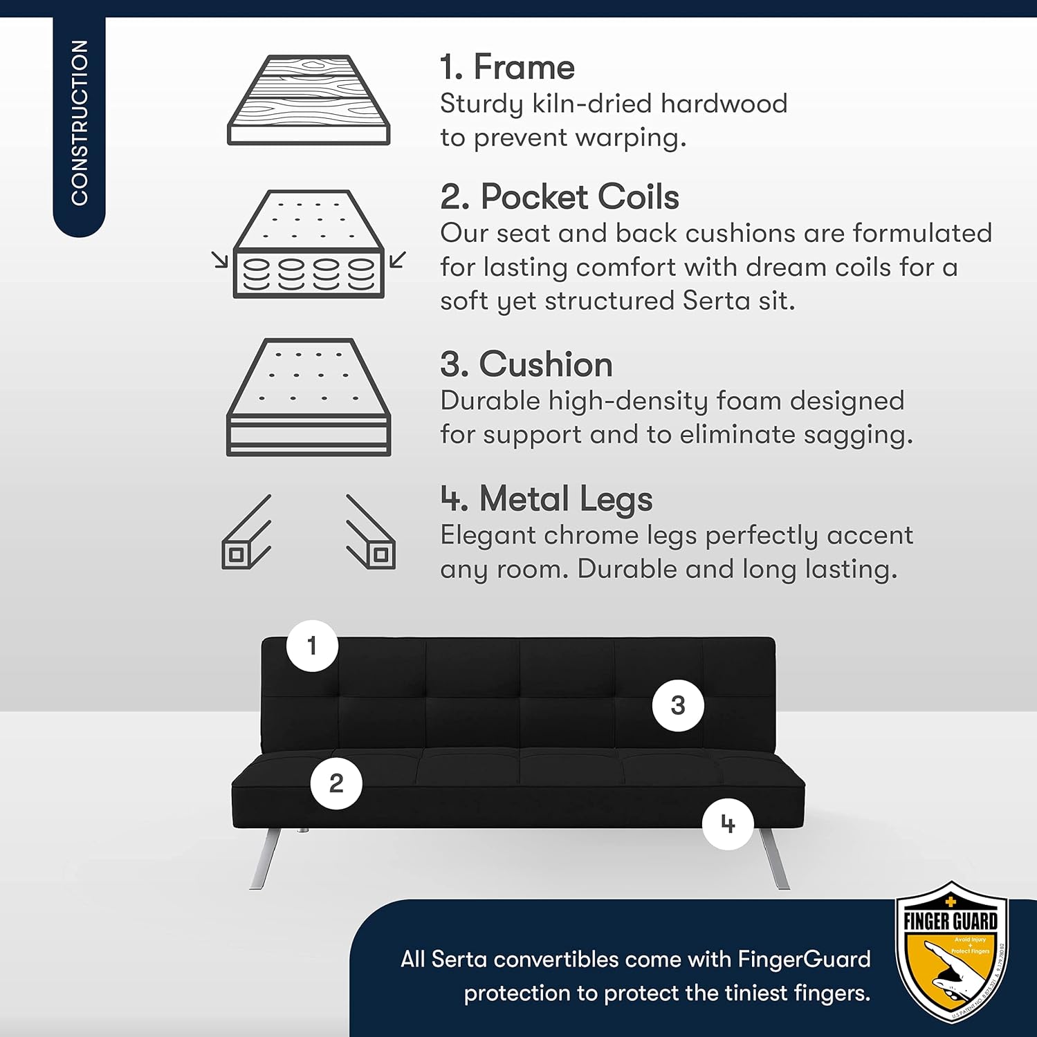 CARE INSTRUCTIONS: Vacuum occasionally, and use the soft brush attachment to remove particles. Spot clean prior to a full clean. Use a dry cloth with soap and water, and apply pressure using circular motions; avoid harsh chemicals to treat., CONVERTIBLE: The back easily folds down to lounge for casual moments. When it's time to sleep, fully recline it to a Serta-comfortable bed. It also has Serta’s Finger Guard protection to avoid injury., Ships in several boxes, may ship separately