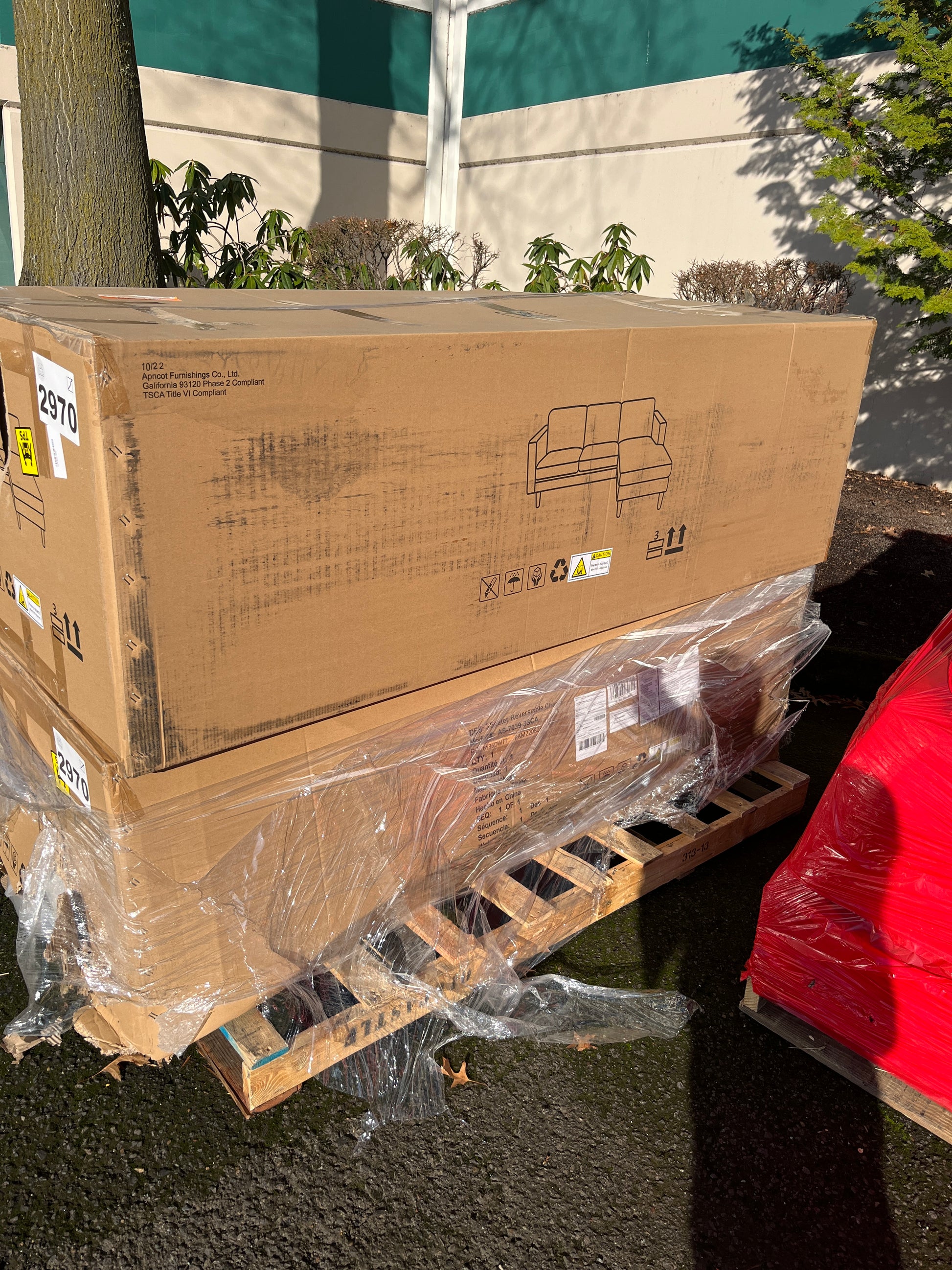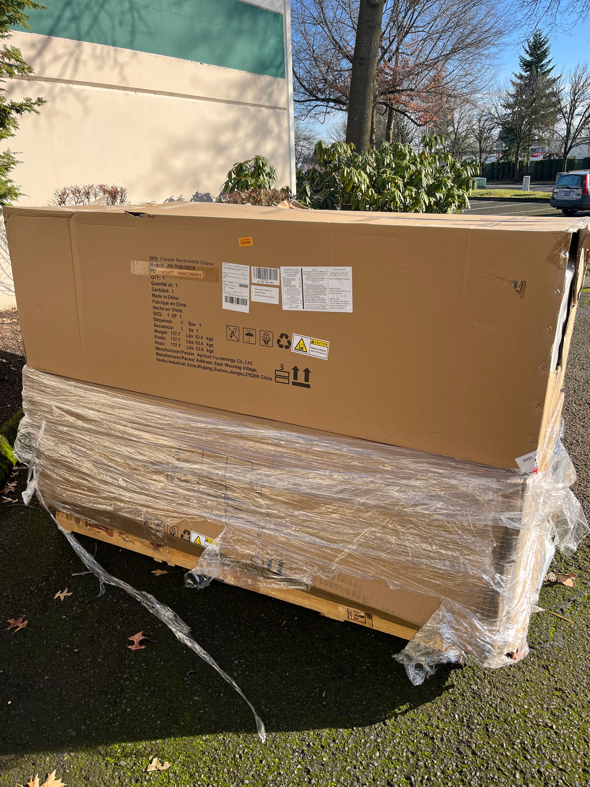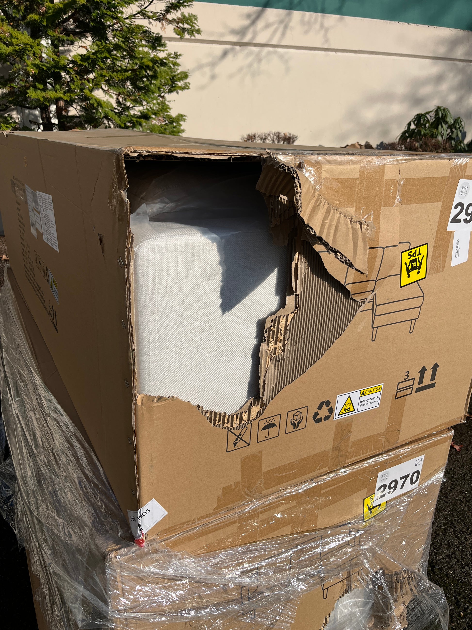 New in damaged box - some of the cardboard has been damaged. No damage to the sectional.