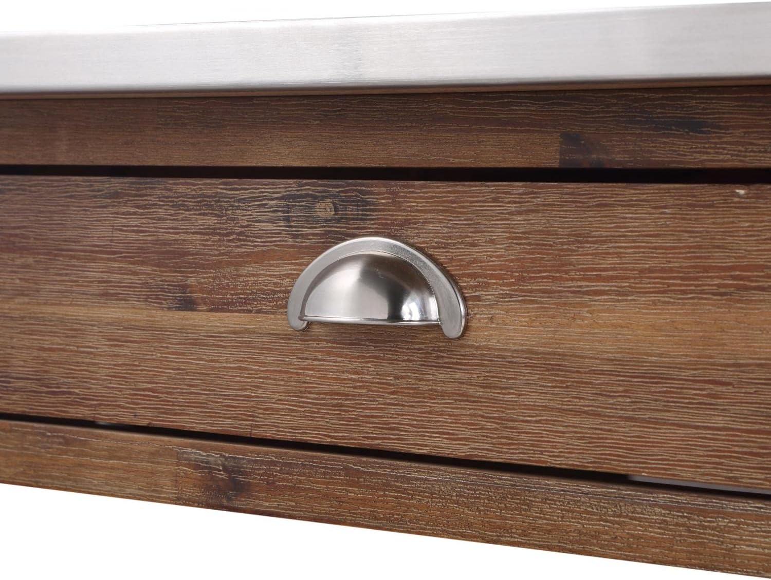 Kitchen cart can hold up to 200 pounds, Shelves can hold up to 50 pounds, Overall width is 45" which includes the towel bar, Constructed from solid rubberwood wood, Stainless steel counter top, Durable stainless steel countertop, Locking caster wheels for easy portability, Open adjustable shelf, Multi-step wire-brush finish