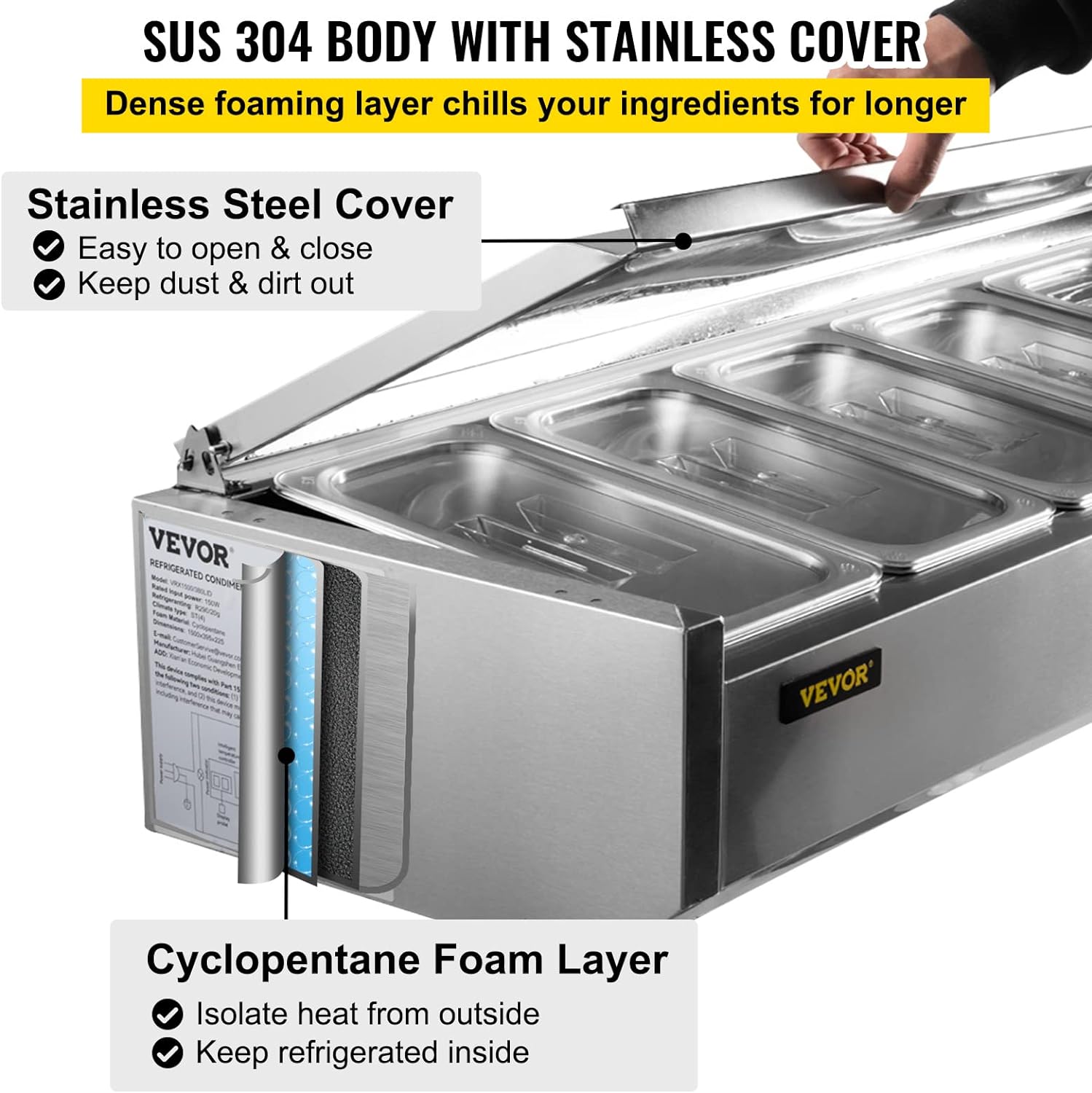 - Rigid 304 Stainless Body & Convenient Cover: Our stainless steel countertop refrigerated prep station will surely stand up to harsh commercial kitchen environments, and is easy to clean, maintaining an attractive appearance. The cyclopentane foam layer contributes to excellent temperature retention. The detachable stainless cover safeguards your ingredients from dust and remains them fresh when not in use. Additional space for placing tableware and prep tools is also provided.