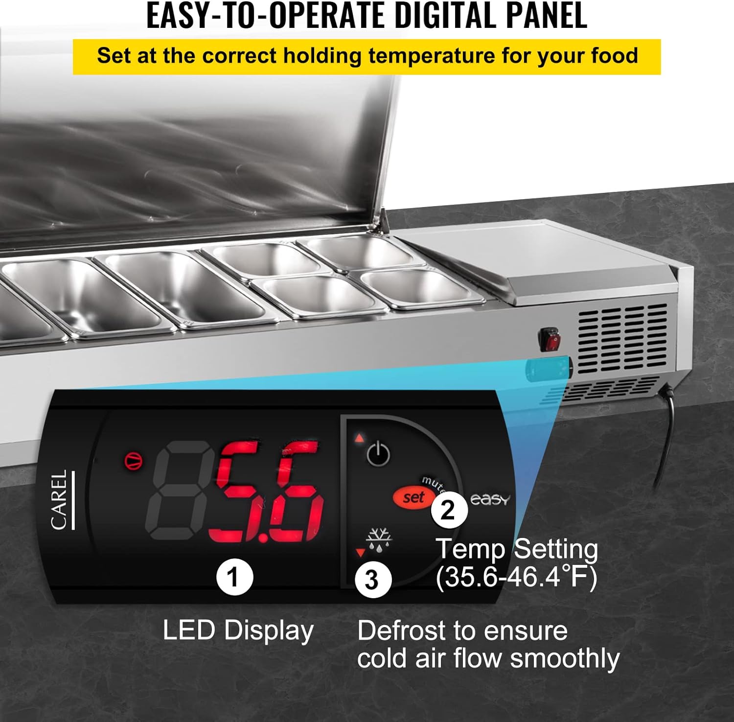 - Effortless to Control and Defrost: An electronic thermostat is integrated into this countertop condiment prep station. The external digital LED panel displays the exact temperature, allowing you to monitor the interior temperatures at a glance. And you can set the temperature between 35.6℉ and 46.4℉. Plus, the one-click defrost function is also equipped to ensure the cold air flows smoothly in the tank without any blocks. Get ready for uniform cooling and fresh-tasting ingredients.