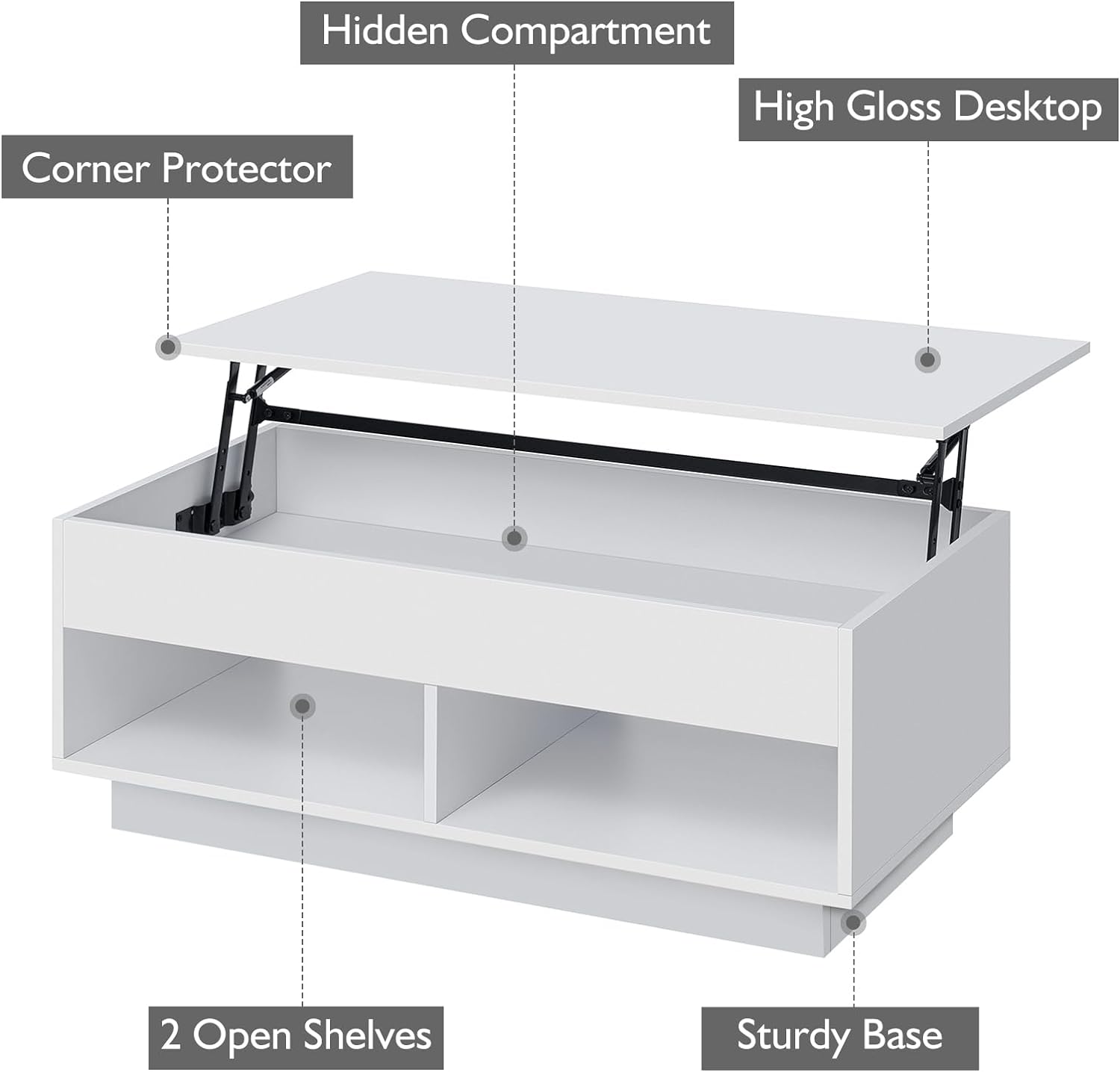 Lift Top Coffee Table: Equipped with top of the-line gas struts for effortless lift and lower of the table top from 15.75" to 21.65", you'll have adjustable height at your fingertips. Its cut-out design allows effortless top lifting, transforming your living room into a personalized workspace or dining area., White Coffee Table with Storage: A broad table top not only acts as a handy space for essentials but also provides sufficient room suitable for home office tasks. Boosting its functionality, the center table comes with a spacious hidden compartment and two open shelves, perfect for storing and displaying everyday items., Strength & Durability : Sized at 37.6"Lx15.75"Wx21.65"H, the lift top table is crafted from premium E1 particleboard, holding up to 200 lbs and promising long-term durability.(Desktop load bearing 60lbs) An easy to clean, water and scratch-resistant high gloss coffee tables adds to its appeal., Adjustable LED Coffee Table: Upping the style of your space, this coffee table provides over 60000 color options and 29 flashing modes. A built in sensitivity adjustable mic enables the LED light synchronization to sound and music rhythm, offering you an immersive experience., WORRY-FREE SERVICE :If the product is defective, damaged, not received, etc., Please contact and send pictures to us first. We are glad to solve it for you. We provide good packaging, which can reduce your chance of receiving damaged coffee table with led.