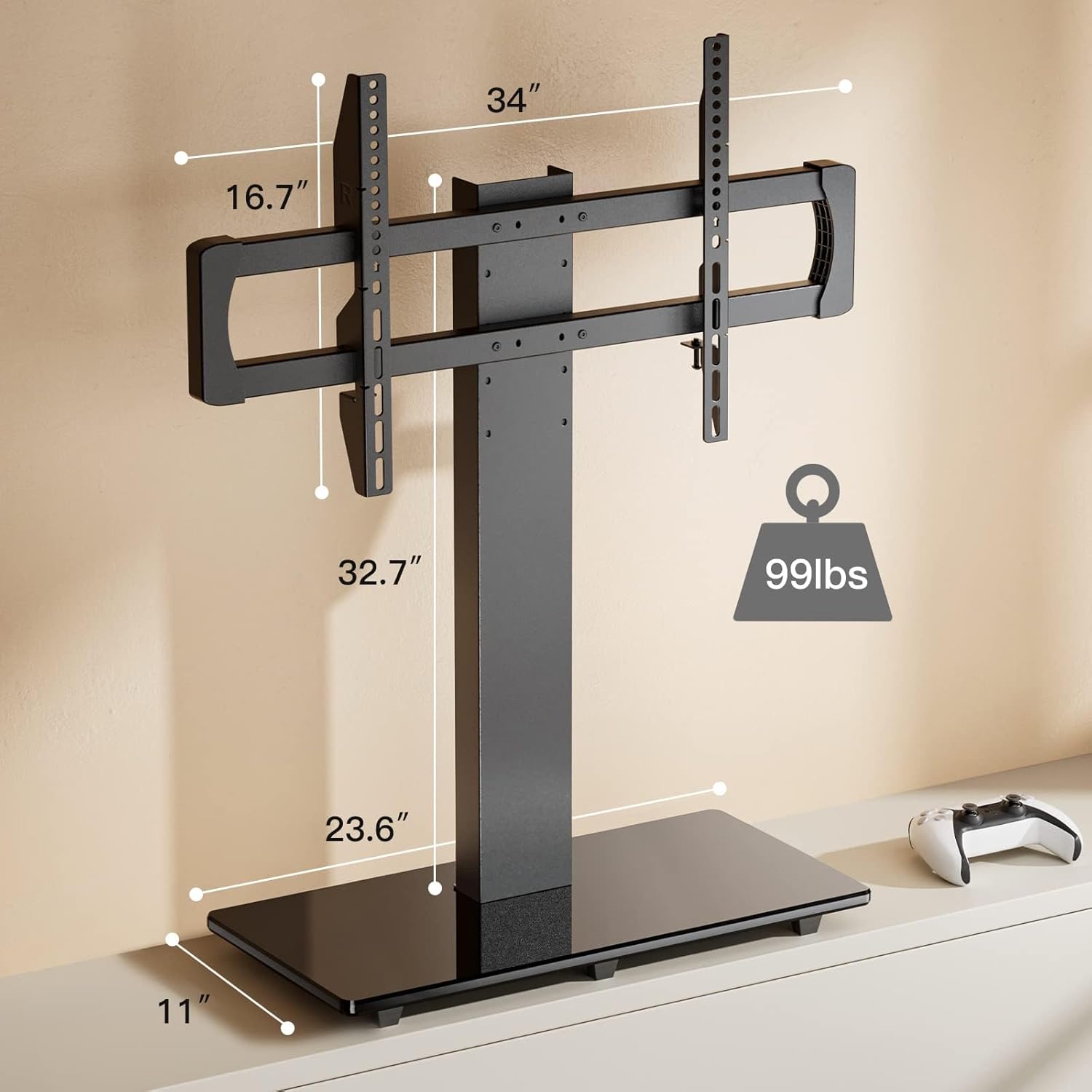 - 【BETTER CABLE MANAGEMENT】 Have you been bothered by messy cables of your TV and media items? No worries, this table top TV stand has a big wire clip at the back of the pillar for better cable management. Also, the wide base of this desktop TV stand offers a decent place for placing your sound-bar, TV box and so. You can organize all items tidy.