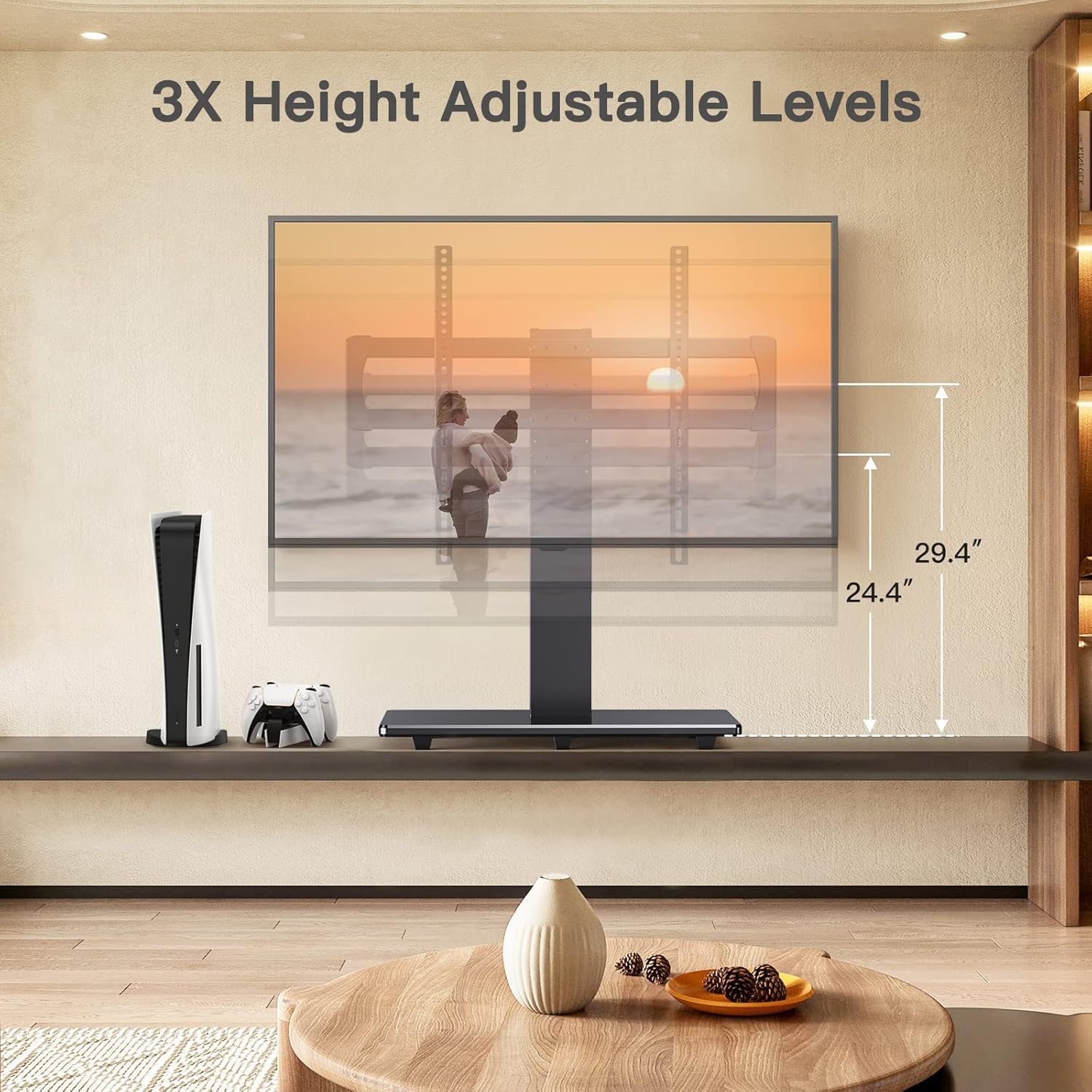 - 【HEIGHT ADJUSTMENT】This height adjustable TV stand is built with heavy-duty steel material and thickened tempered glass. Also, it provides 3 options in height adjustment from 24.4in to 29.4in which offers you extra space beneath the TV.