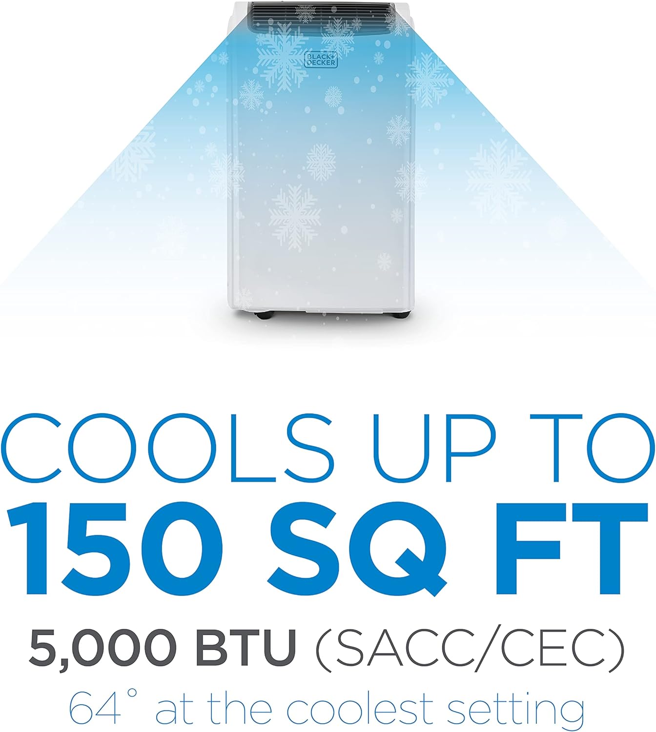 - QUIET & POWERFUL - Our 5,000 BTU SACC/CEC (8,500 BTU ASHRAE) compact air conditioner (16.5 x 12.2 x 27.6 in.) will keep you cool and comfortable all summer. An adjustable fan speed cools the air to 64°F at the coolest setting. Sleep mode makes it extra quiet while you rest.