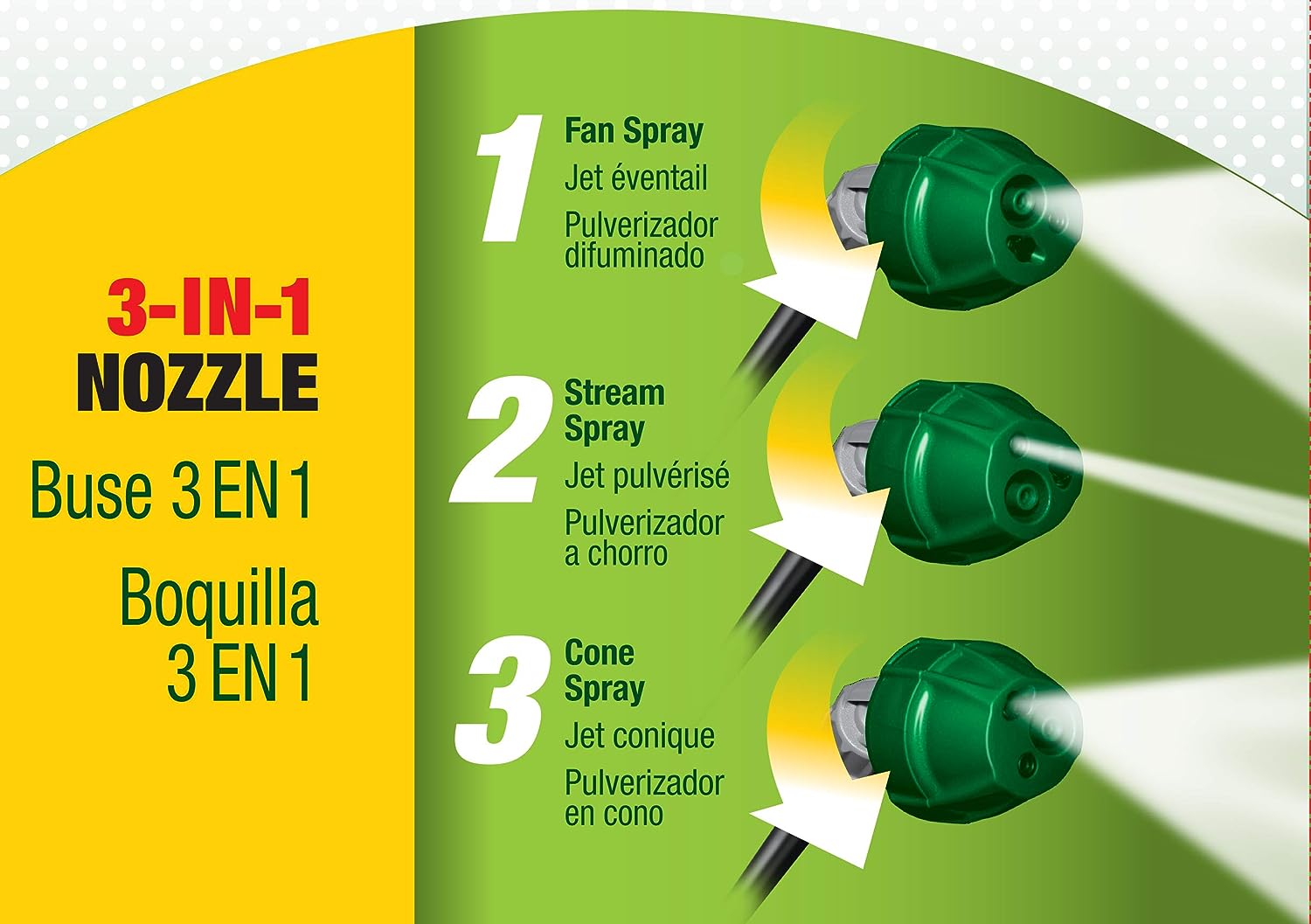 - 3-In-1 nozzle with three settings: fan spray, stream spray, and cone spray