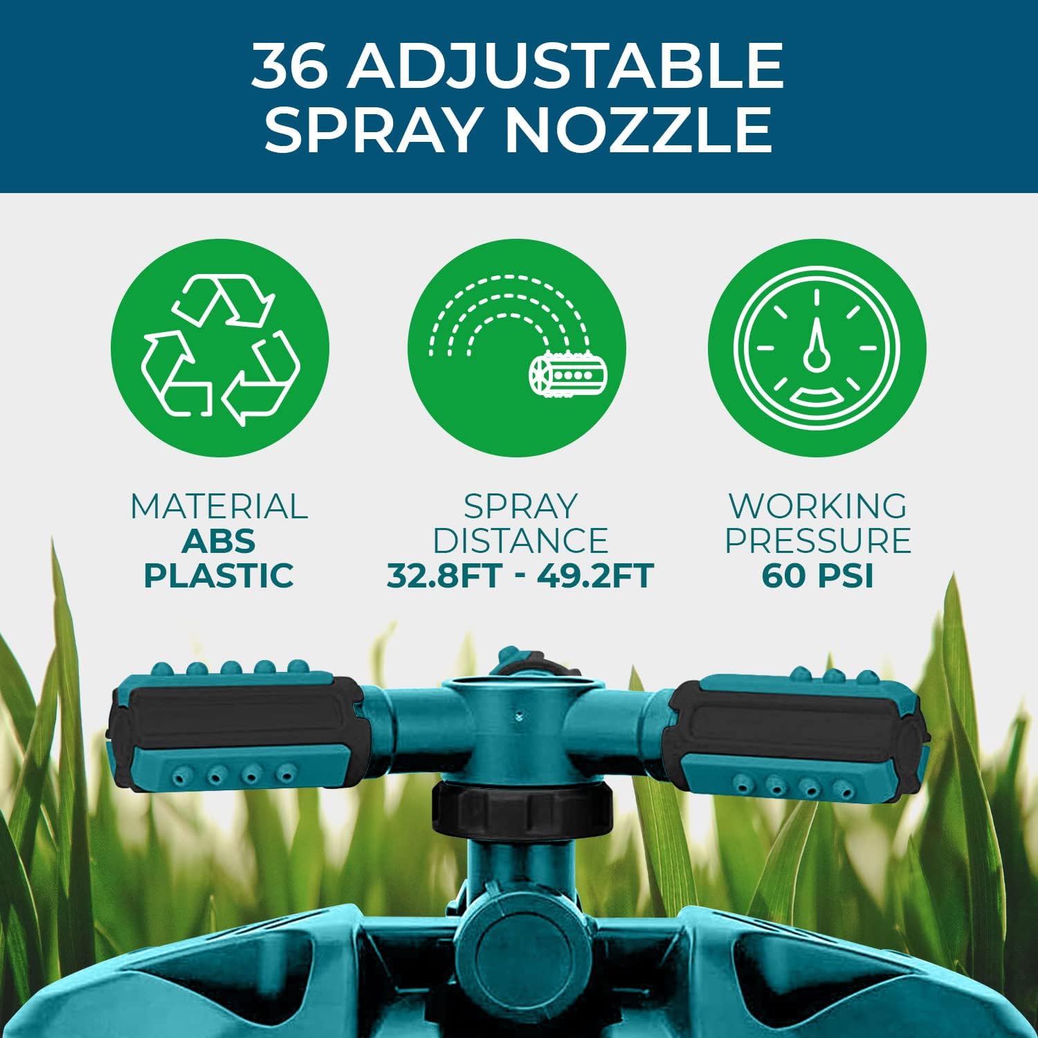 - Premium Construction and Material: Made from high quality ABS plastic and rust proof polymer for maximum durability and function. This sprinkler will last from season to season.
