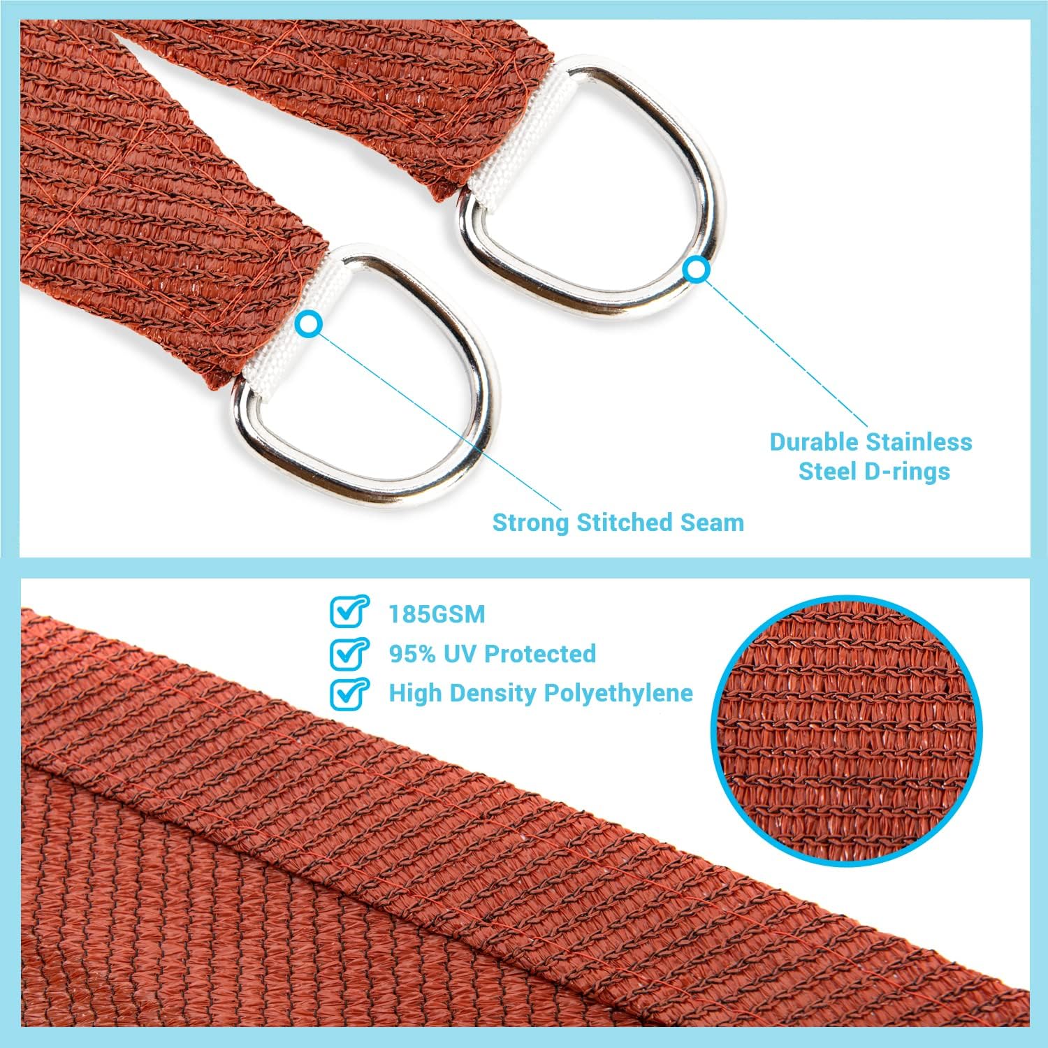 - High Quality - The patio shade has 100% High Density 185GSM Polyethylene fabric, with strong stitched seams and durable stainless steel D-rings. The fabric is breathable and 95% UV block, allowing air and light to pass through for a more comfortable space. This sail shade also comes along with sturdy polyethylene ropes
