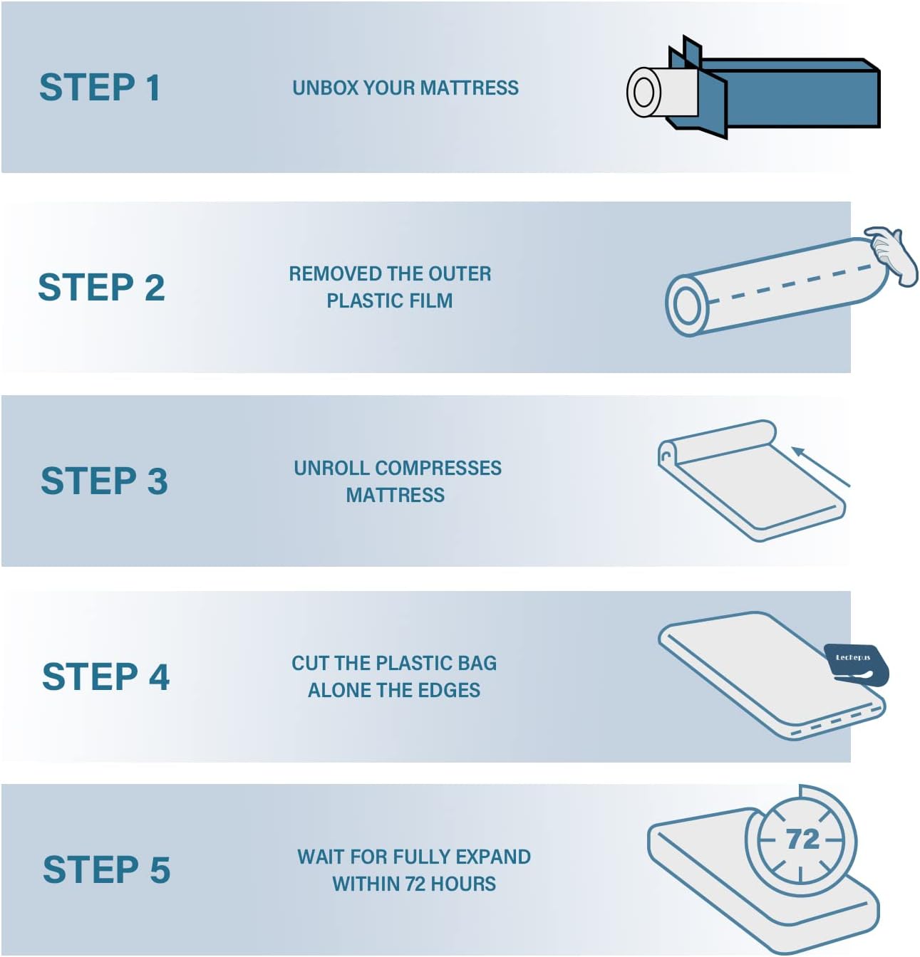 - [Easy Set&Mattress in Box] : Each of your mattress is compressed and boxed.When it is delivery to your home, you can easily move through narrow hallways and staircases by yourself.And our lechepus mattress fits all frames,such as box spring, floor, slatted base, flat platform or adjustable bed.Please wait 72 hours for mattress to fully expand.