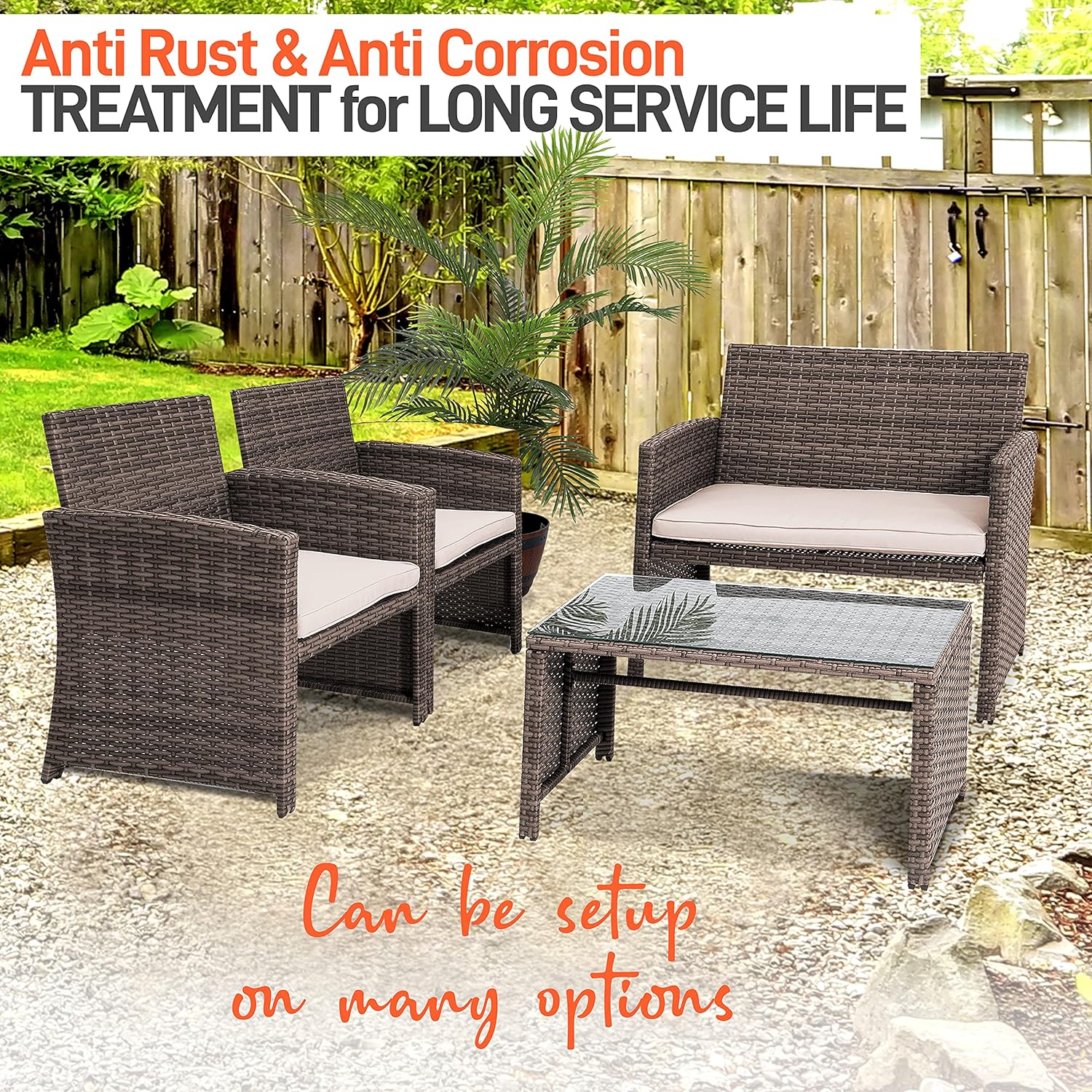 - INCLUDES SOFT CUSHION: The 4pc set includes water-resistant cushion seats that give you extra comfort & covers that can be removed for easy cleaning & maintenance. The furniture set is lightweight and easy to move or transfer in any part of the house