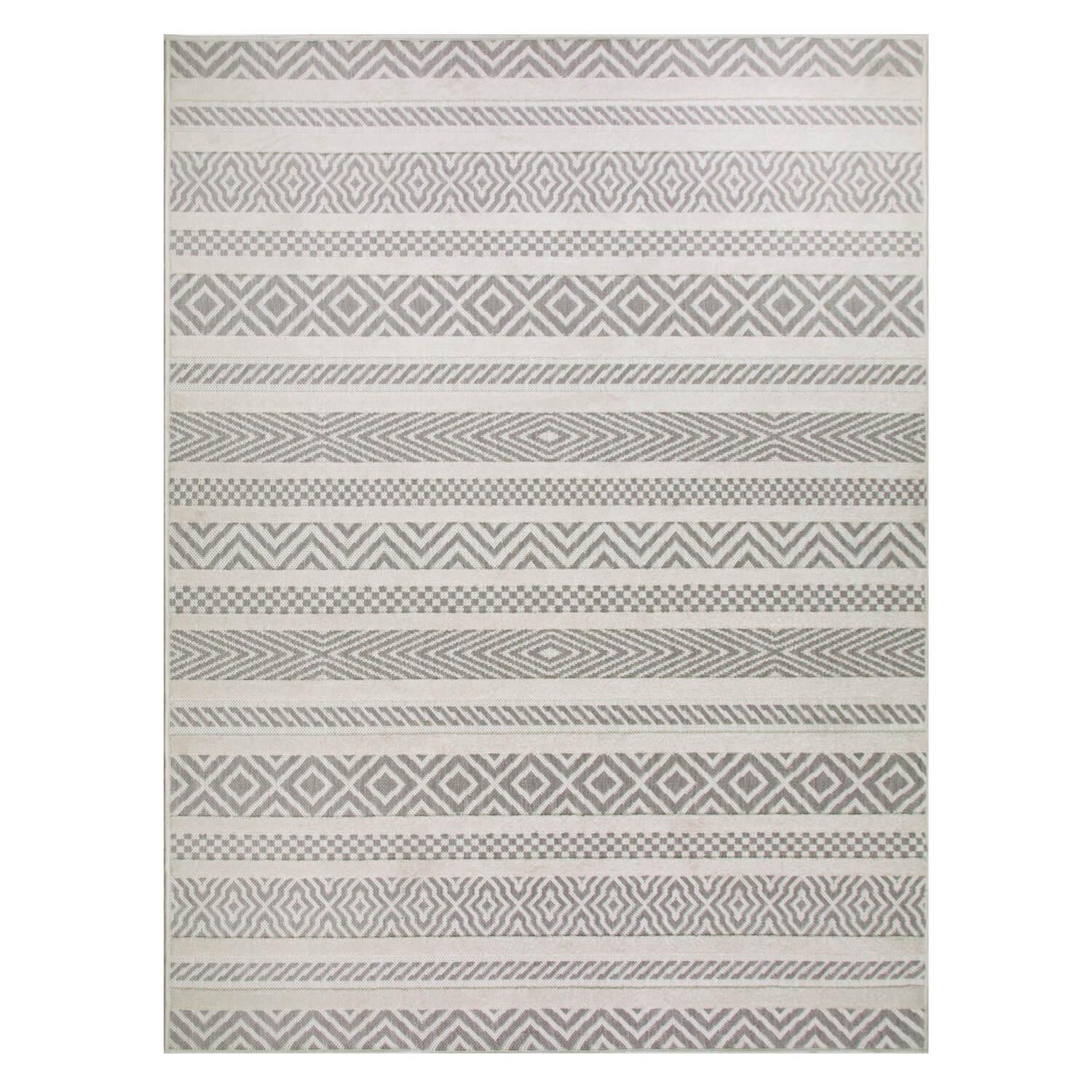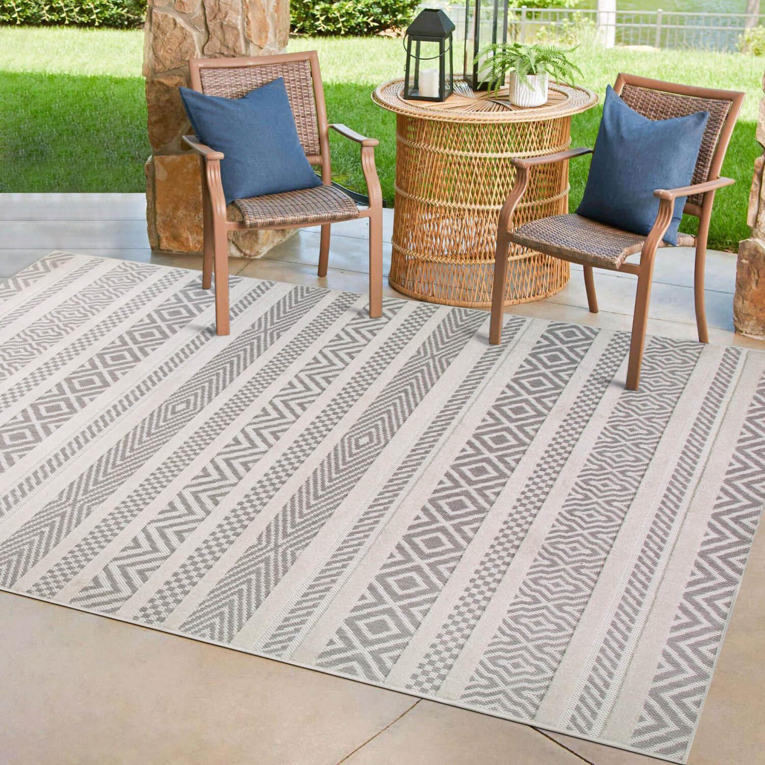 The Leick Home 595777 Everald Indoor Outdoor Rug offers a pleasing combination of neutral gray and beige shades in a variety of linear patterns that work together to create a modern feel. This lightweight door mat rug is crafted from 100% polypropylene making it durable and portable for both indoor and outdoor use. Made for standing up to heavy use, kids, weather or pets, this versatile rug can be used throughout the house or outdoors. Synthetic fibers help protect from sun damage and water pooling, while it retains its vibrant color. Low-pile and low-shedding, this rug is both soft and easy to clean. Just blot stains, hose to rinse off, sweep or use a leaf blower. Recommend a rug pad for indoor use and bringing indoors during extreme weather. Rug measures 3footx5foot. Crafted in Turkey. Comes with a 1-year limited warranty. Designed and manufactured by Leick Home, the trusted source for quality home furnishings for every taste and budget.