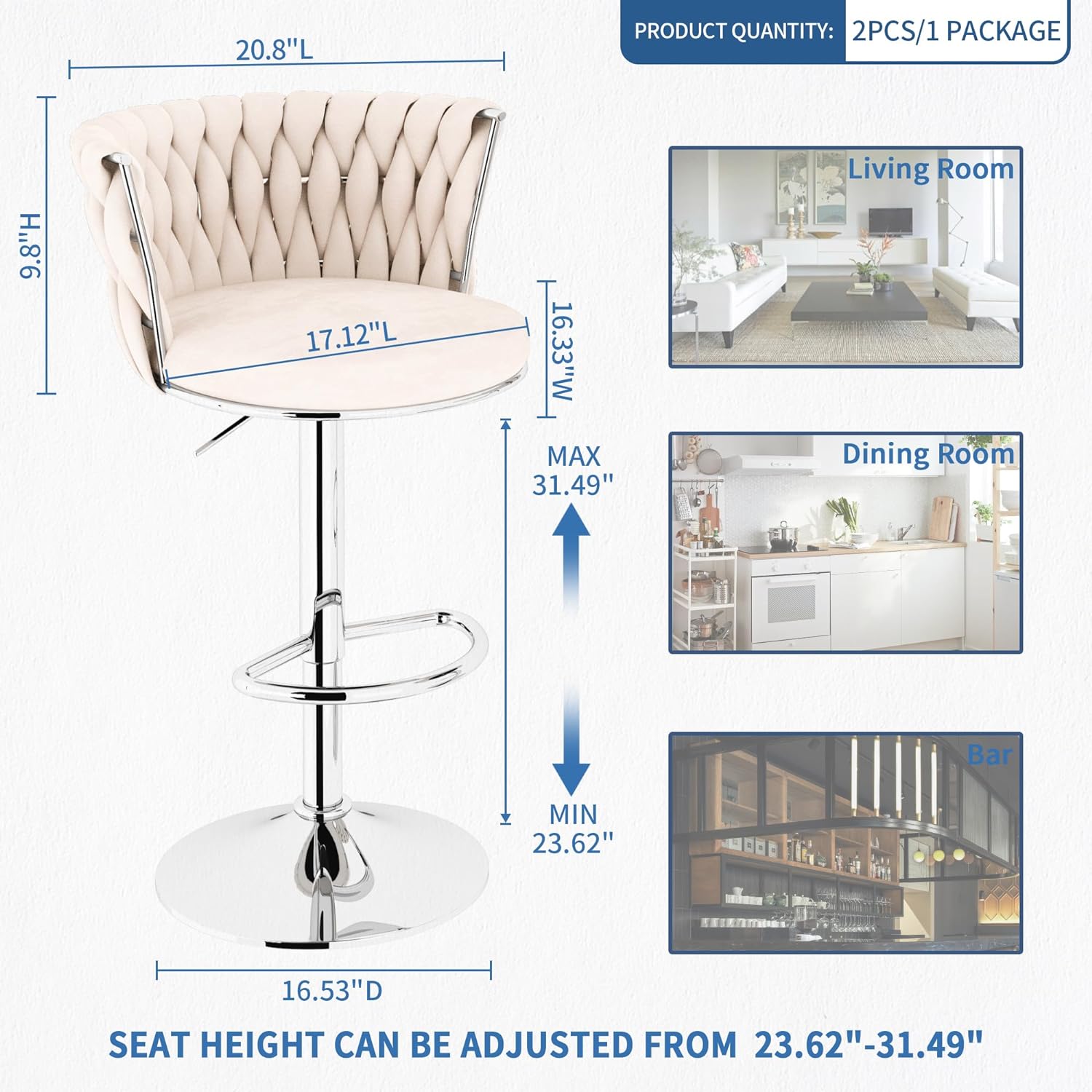 - ✔ 【ADJUSTABLE BAR CHAIRS】- Barstools can adjust from 23.62-31.5” so you can seat guests of every height, and the seat is a generous 17.12” wide , with a weight capacity of up to 350 lbs. The chairs sit on a high-intensity pneumatic rod that rotates 360 degrees for full mobility. So lean back, kick up your feet on the built-in footrest, and enjoy.