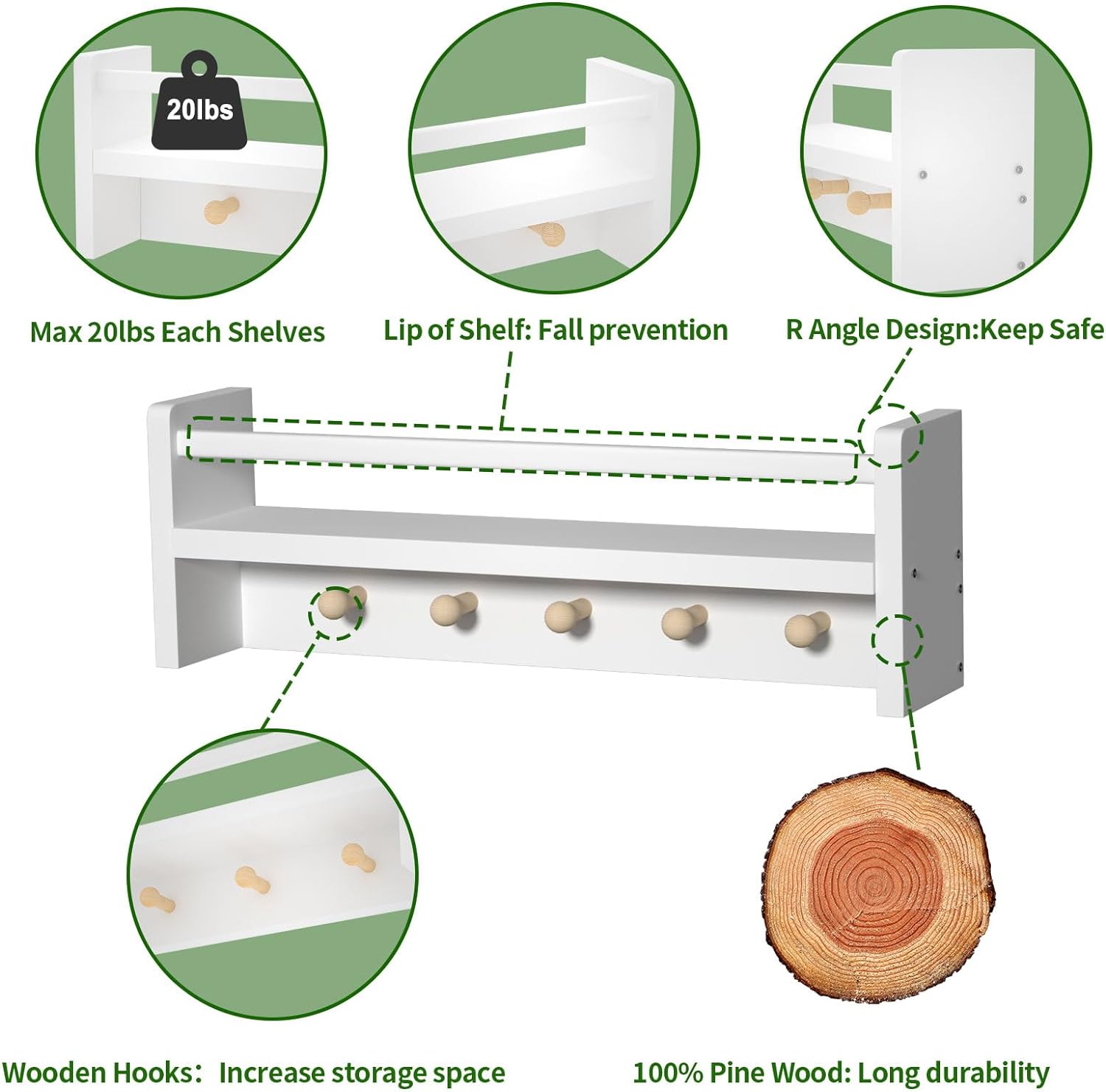 - Sturdy Structure with Metal Connectors: The pine kids wall bookshelf is expertly connected by metal, providing enhanced stability and reducing the risk of deformation. The set includes 2 kids bookshelf wall mounted measuring 23.62"L*4.6"W*4.6"H and 1 hook shelf sized 24"L*4.6"W*7.8"H.