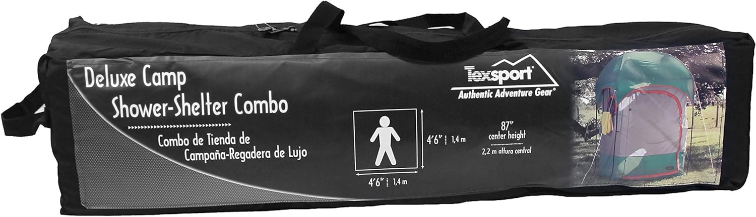 - 5 Gallon Camp Shower Measures 87"H x 4'6" x 4"6" and includes mesh shower rack inside and removable hanging towel bar outside