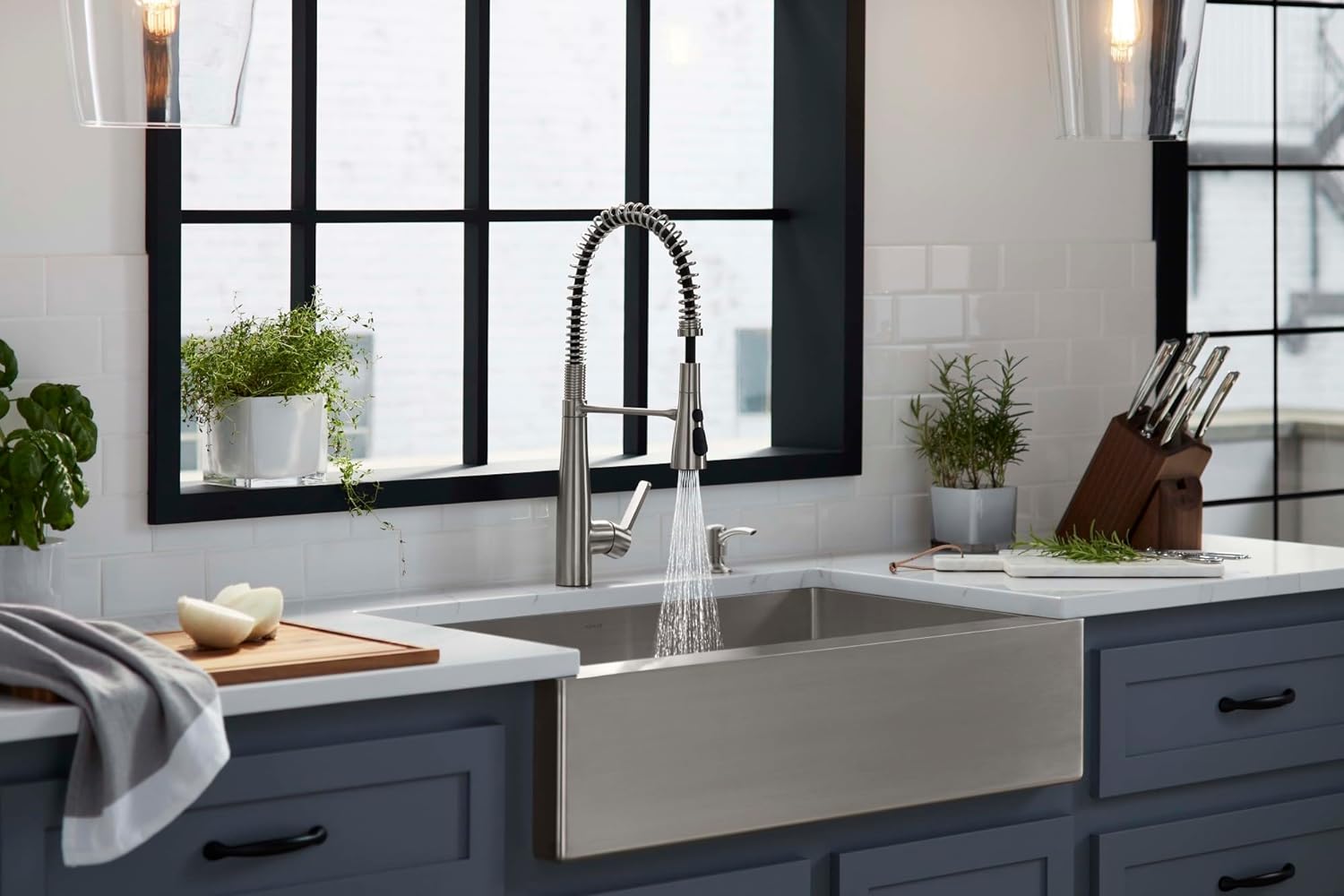 NEW - KOHLER K-R22745-SD-VS Semi-Professional Kitchen Faucet with Soap Dispenser/Lotion Dispenser, Commercial Kitchen Sink Faucet with Pull-Down Sprayhead, Vibrant Stainless - Retail $306