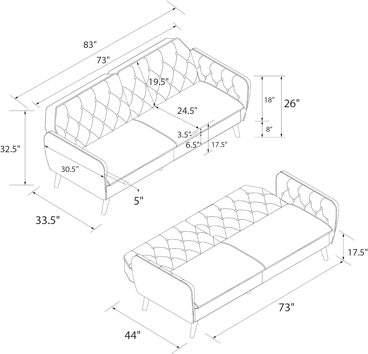 - Futon dimensions: 83"L x 33.5"W x 32.5"H. Sleeping dimensions: 73"L x 44"W x 17.5"H. Weight limit: 600 lb