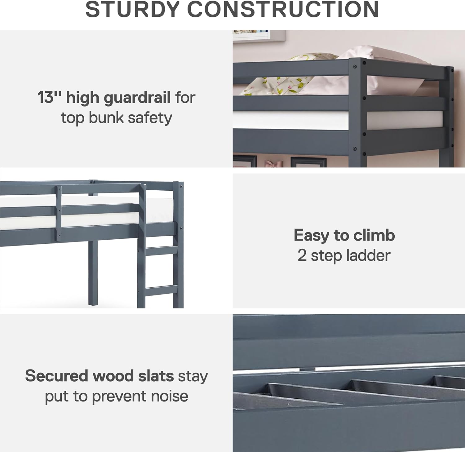 - Built for safety: The solid pine wood bed frame incudes an integrated 2-step ladder and 13" guard rail for top bunk safety. Assembled dimensions: 78”L x 43”W x 43”H. Max weight limit of the top bunk is 165 lbs.