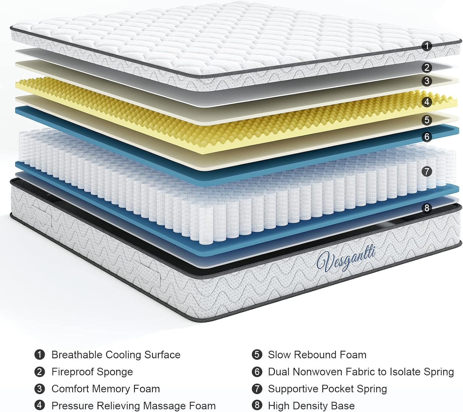 - 【Vesgantti Luxury Support System】-- Luxury MULTILAYER FOAM AND POCKET SPRING SUPPORT SYSTERM not just providing better support for your body, but also can absorb more pressure come from your body and the spring, providing more buffers for your body. Fully relax your muscles, greatly improve your sleeping quality