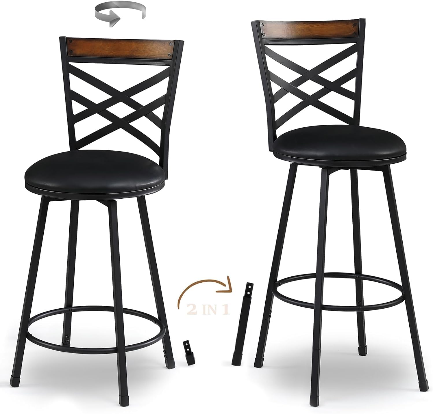 - Functional: 360 degrees swivel padded seat is upholstered in easy-to-clean faux leather. Two sizes of adjustable feet with non-slip caps at the bottom allow you to take it from a counter height to a bar height stool in no time. A sturdy iron base is steady and strong, bearing up to 200-250 lbs.
