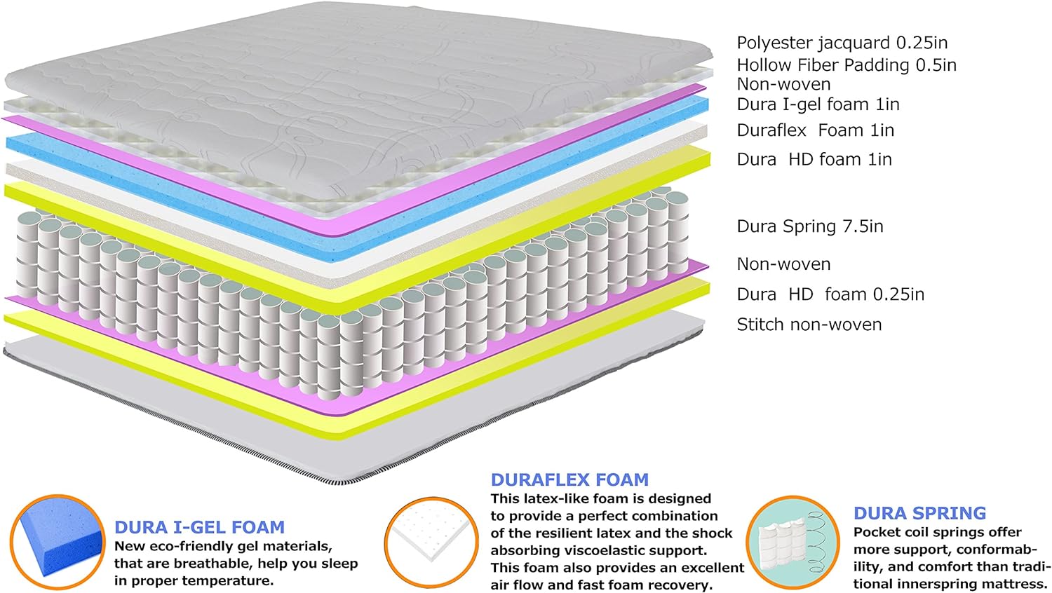 - [ 4 Layers ] - 0.75" Cooling Gel Memory Foam + 1" High Density Foam + 7.5" Pocket Springs + 0.25" High Density Foam