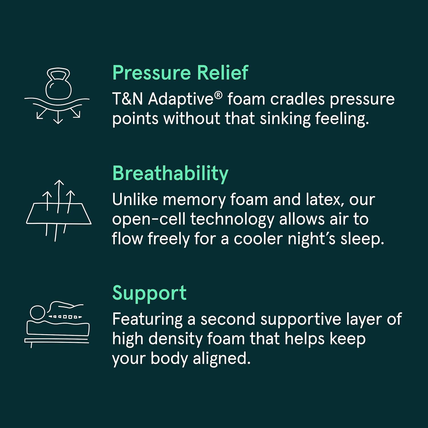- Cool Sleeping - Our open-cell cooling technology foam works with the heat-conducting graphite and cooling gel-infused in our T&N Adaptive foam to wick away heat and moisture for a deep, restful sleep