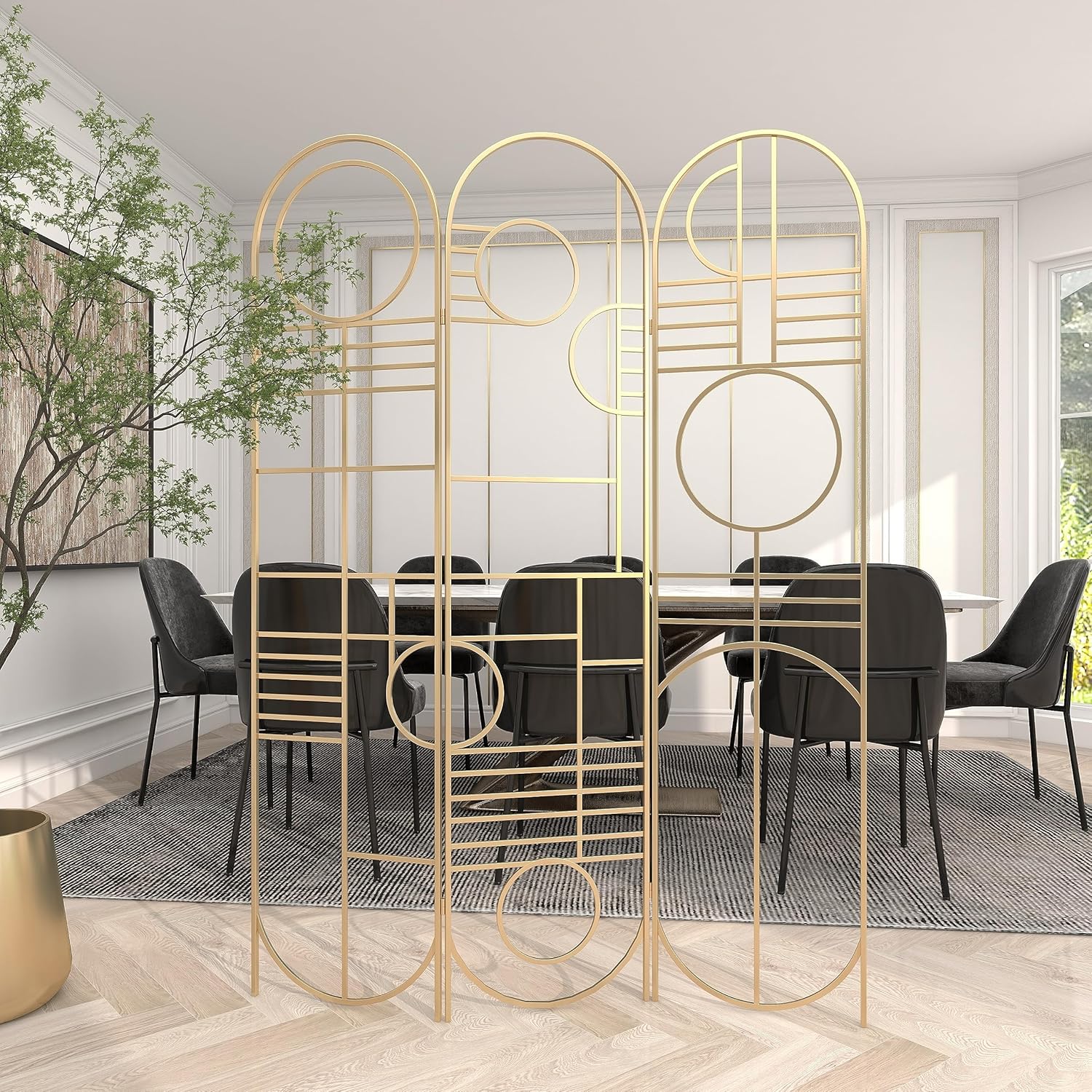 - GOLD SATIN FINISH Oval room divider and folding privacy screen boast a geometric satin gold finish that adds a touch of modern elegance to any space
