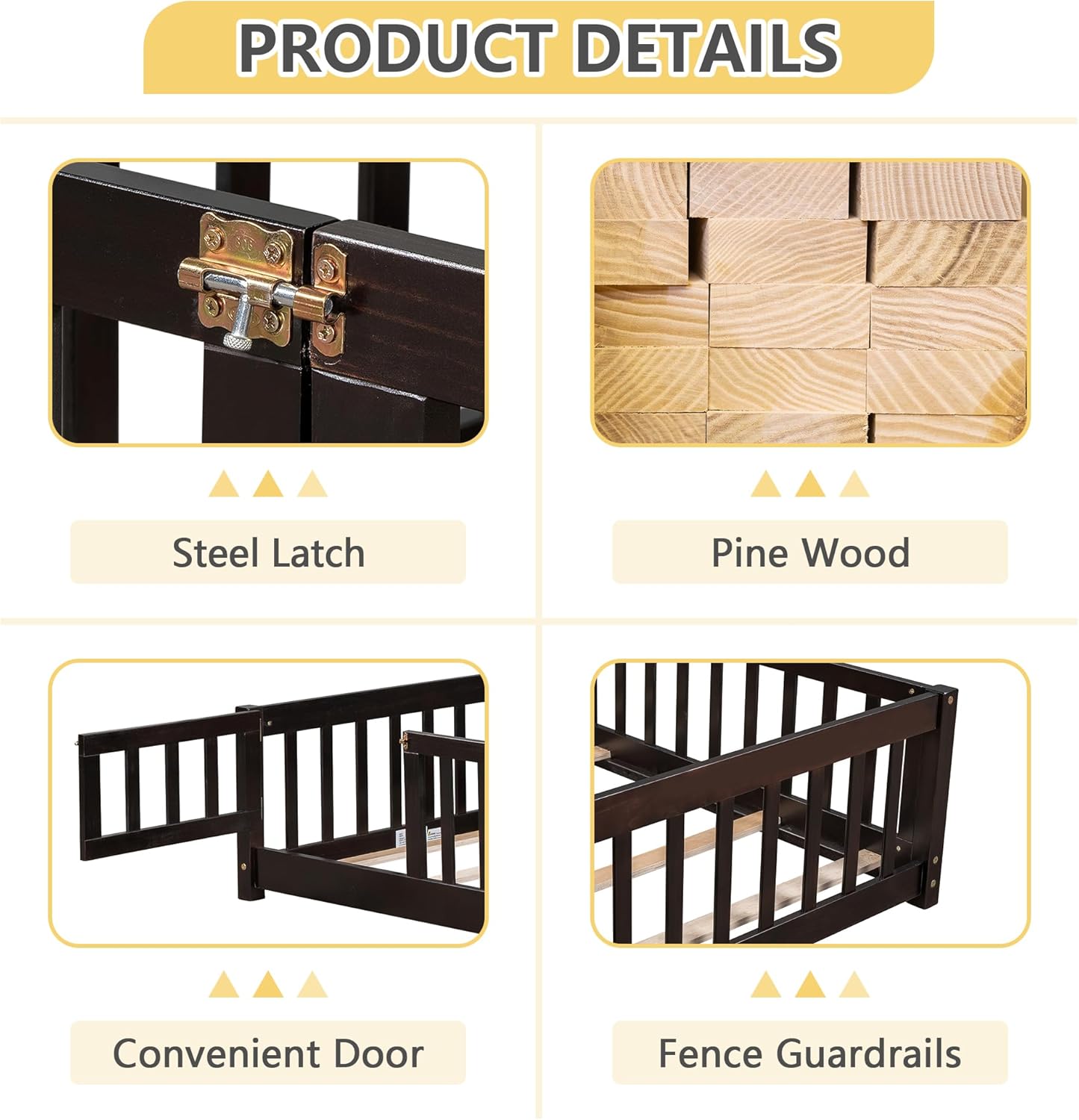 NEW - Dolonm QUEEN Size Montessori Bed, Toddler Floor Bed for Kids, Floor Platform Bed with Fence Guardrails and Door, Montessori Floor Bed Frame, Wooden Floor Bed Toddler, Espresso