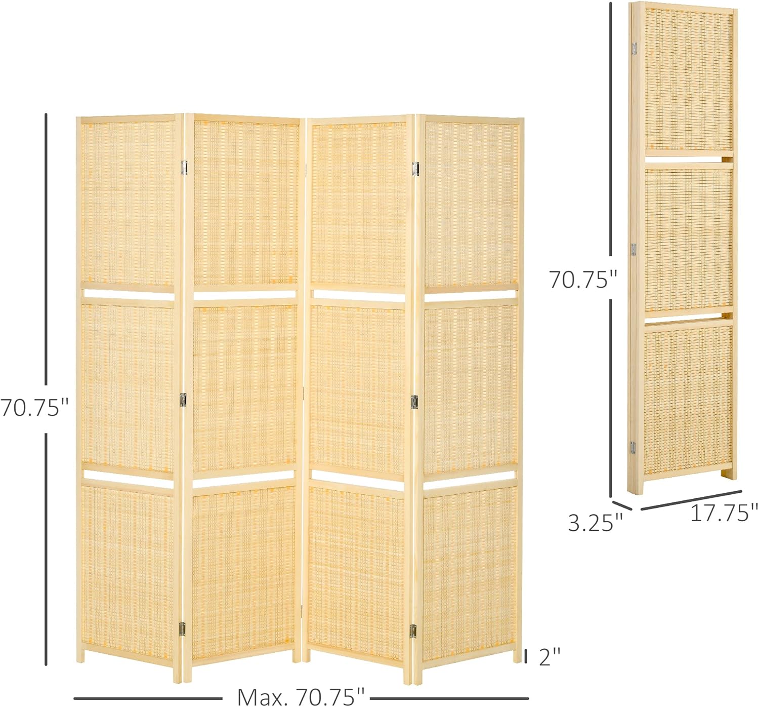 - PANEL ROOM DIVIDER INFO: Overall Dimensions: (fully extended) 70.75" L x 70.75" H x 0.75" T. Each Panel Size: 17.75" L x 70.75" H x 0.75" T. Each Shelf Size: 66.25" L x 7.75" W x 0.75" T