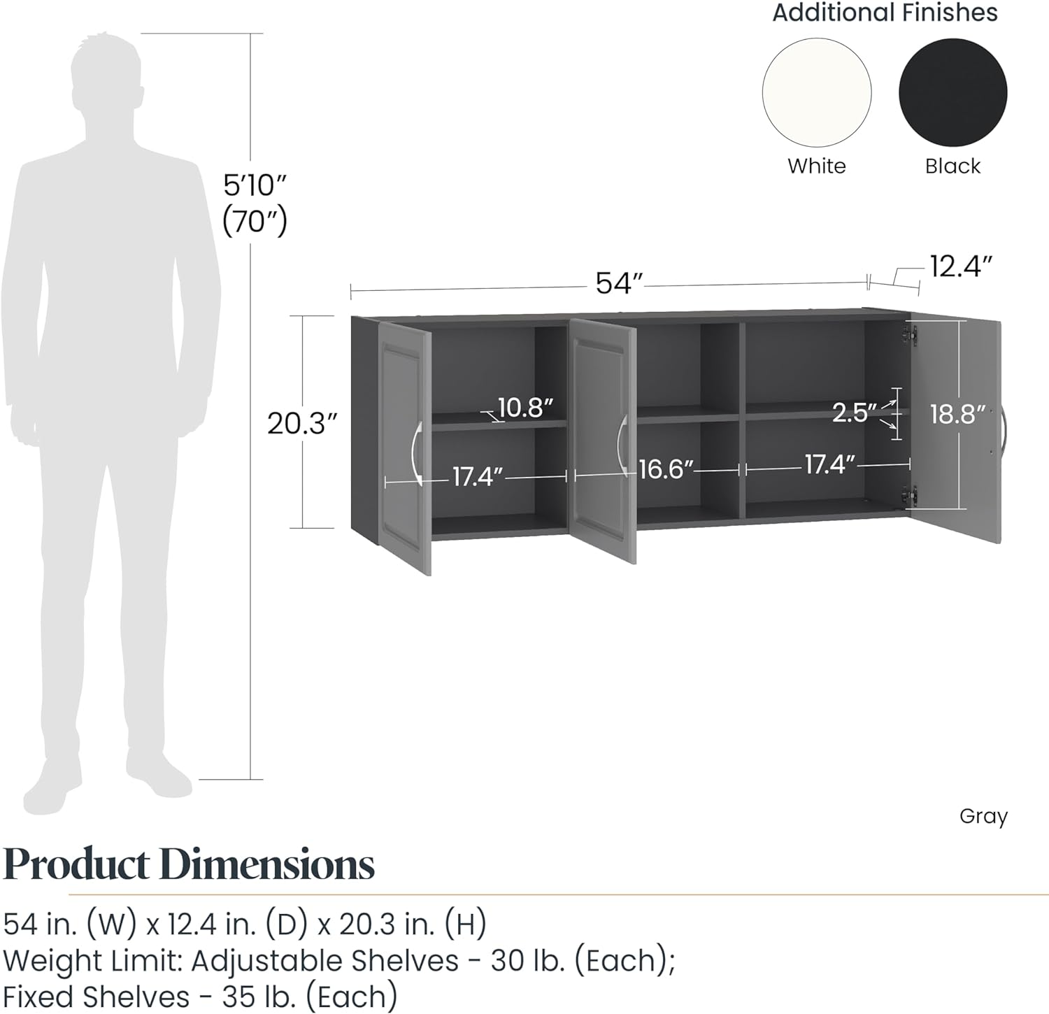 - Each Cabinet features 1 adjustable and 1 fixed shelf to customize your storage