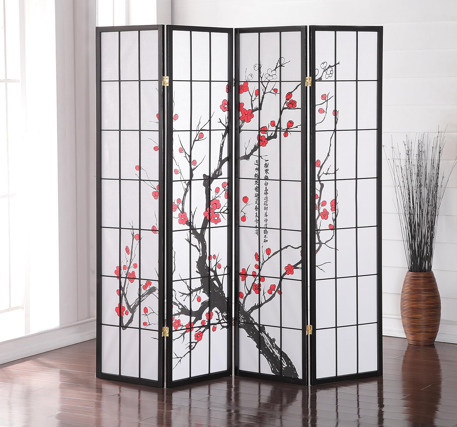 NEW - Roundhill Furniture Black Japanese 4-Panel Screen Room Divider, Plum Blossom - Retail $89