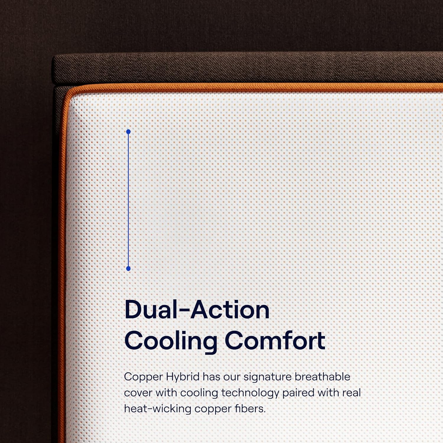 - DUAL-ACTION COOLING and 7 LAYERS OF ENHANCED COMFORT - Copper Hybrid’s cover is designed with dual-action cooling technology. Heat-absorbent polyethylene fibers and real copper fibers help wick excess body heat away to promote cooler sleep. A Euro Top with therapeutic memory foam and ActiveLift cradles your body, promotes proper spinal alignment, and relieves pressure, while the dynamic transition layer provides tailored support, plus rebound and bounce. Individually-wrapped Infinity coils ensure edge-to-edge support, while the ActiveSupport base gives stability to layers on top. The shift-resistant lower cover with handles makes it easy to move.