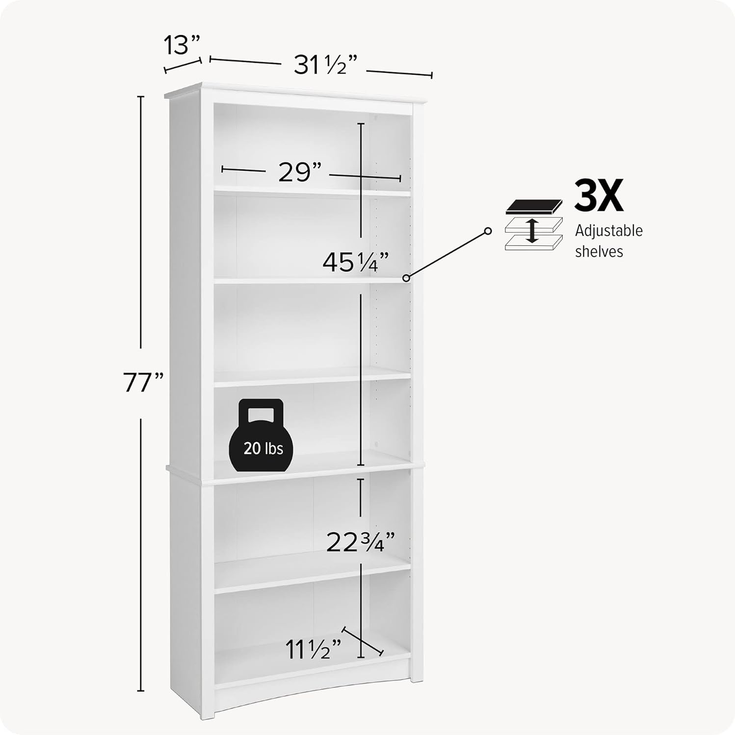 NEW - Prepac Sonoma Tall 6-Tier Bookcase 77inH with 3 Adjustable Shelves, White Storage Cabinet, Modern Display Cabinet, Bookshelf with Storage Shelves for Home Office, Living Room, Bedroom Organizer - Retail $199