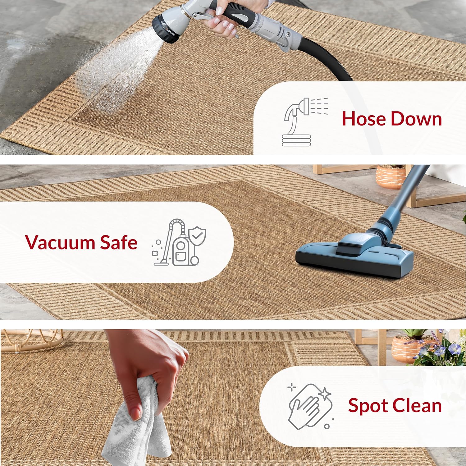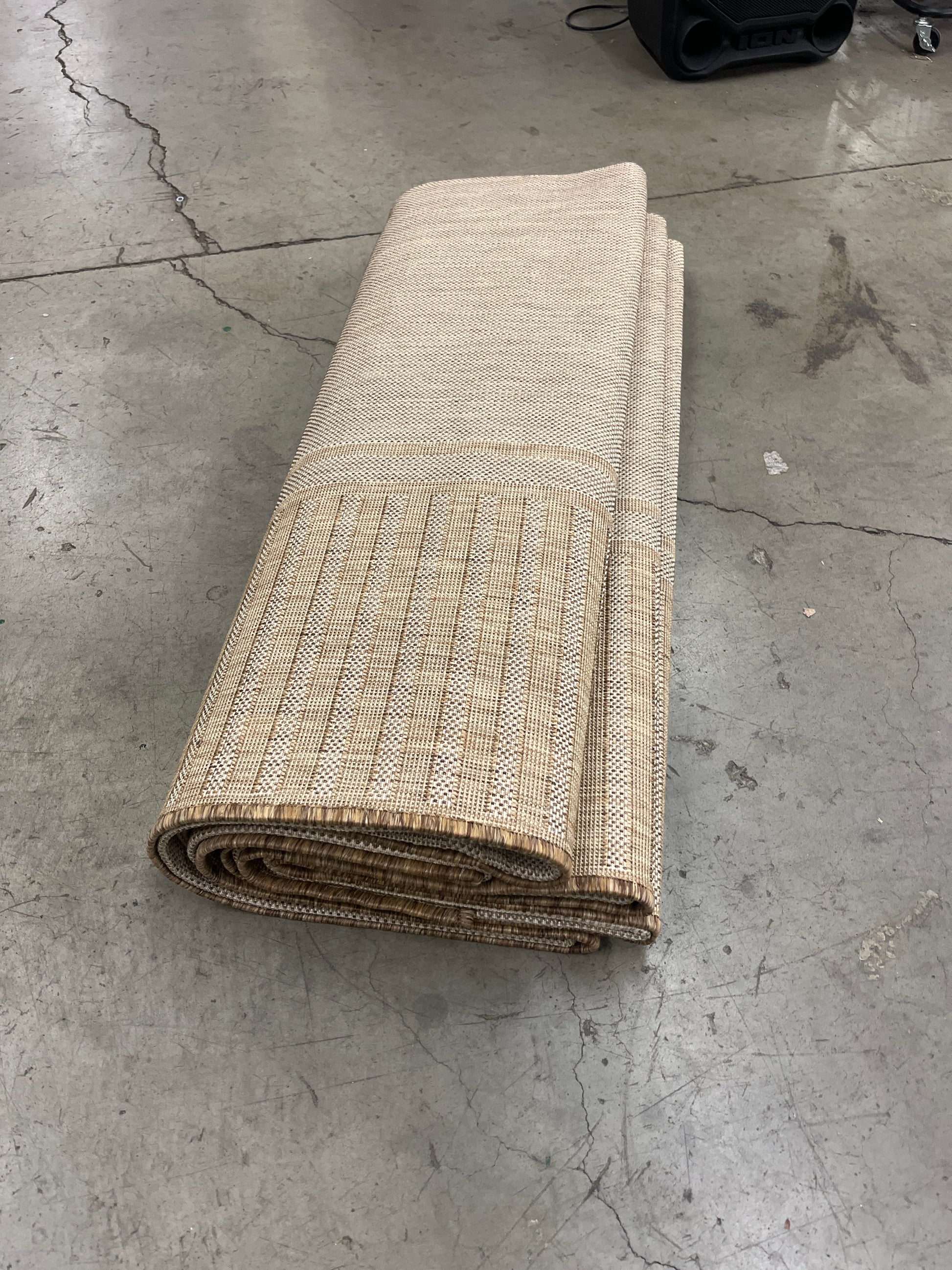 NEW - nuLOOM 10' x 12' Outdoor Area Rug, Casual Design With Striped Border, Stain Resistant, Highly Durable, For Patio, Balcony, Bedroom, Living Room, Dining Room, Bathroom, Light Brown