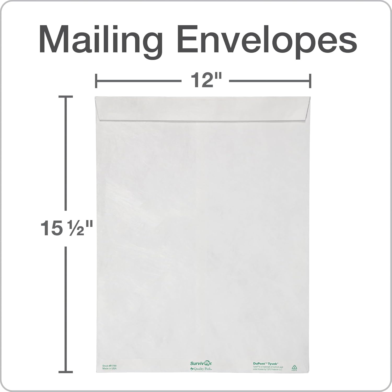 Quality Park Survivor Tyvek Shipping Envelopes, 12" x 15-1/2", Made with Lightweight and Strong DuPont Material, Peel and Seal Closure, White Shipping Envelopes, 100 Per Box (QUAR1790) - Retail $69