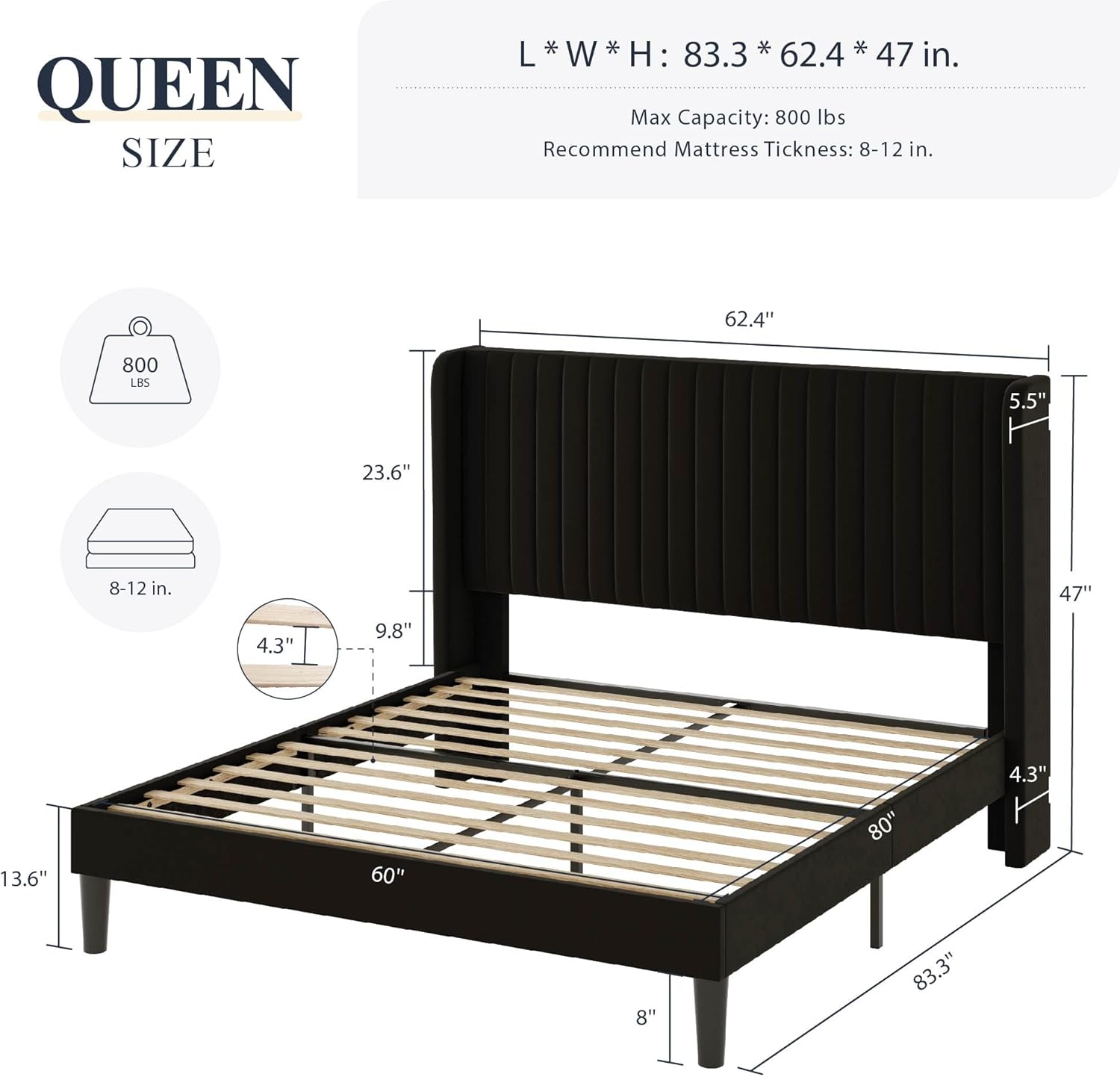 Allewie Queen Size Velvet Bed Frame/Vertical Channel Tufted Wingback Headboard/Upholstered Platform Bed/Strong Wooden Slats/No Box Spring Needed/Easy Assembly/Black