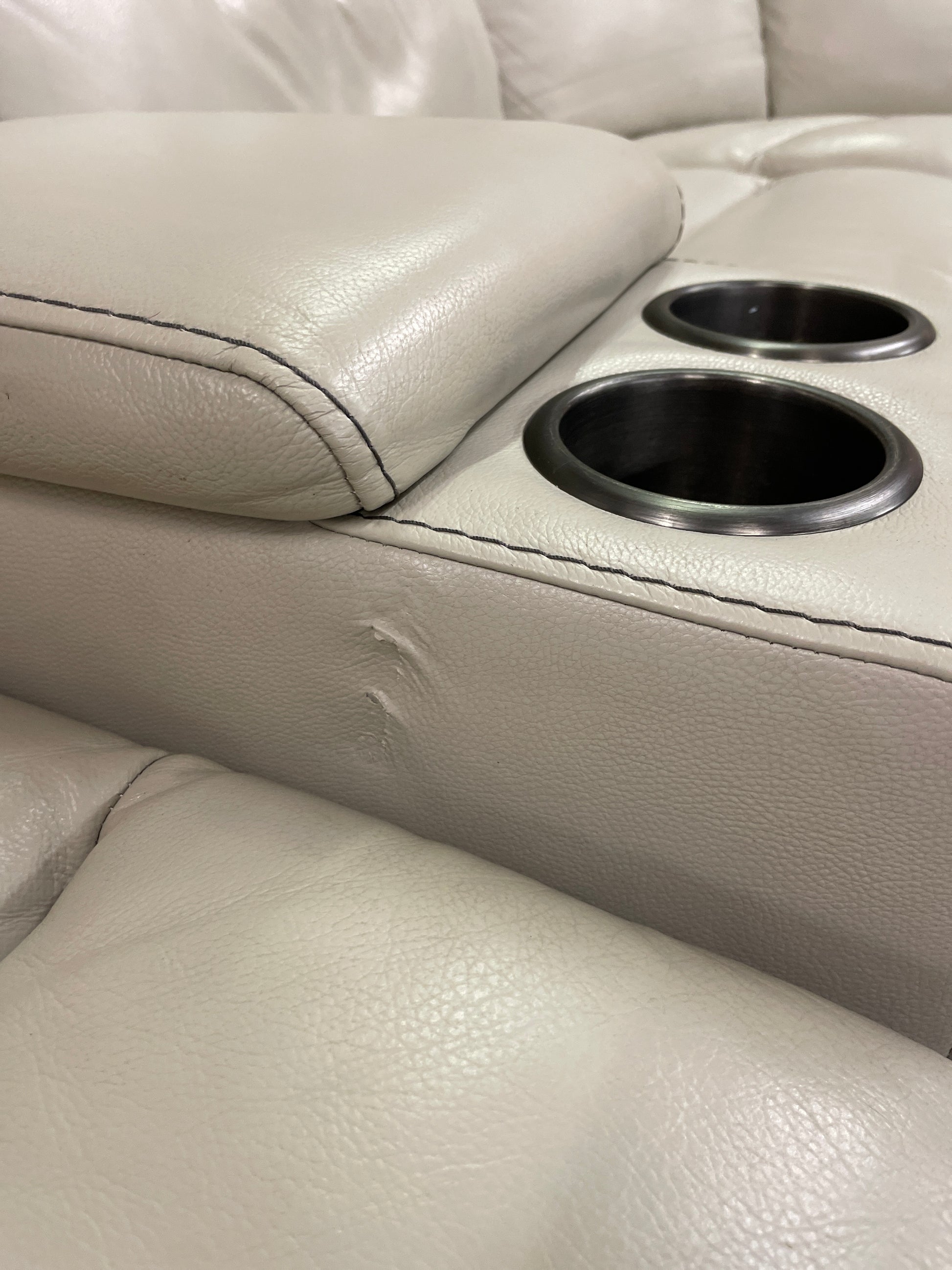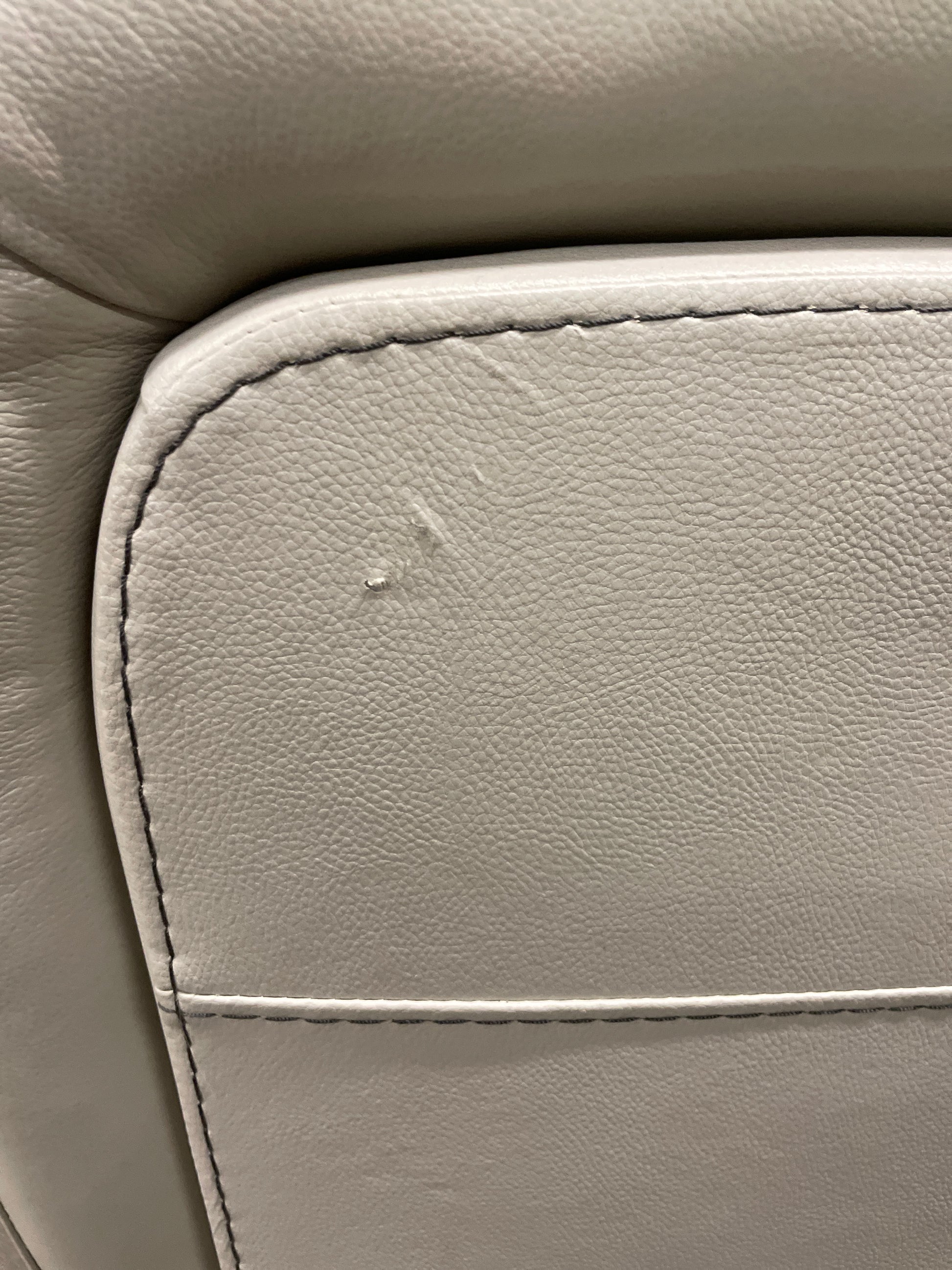 In good condition. The leather is in good condition. Several scratches on the back side of the sofa in various spots. A couple scratches on the front facing sections, but nothing major.