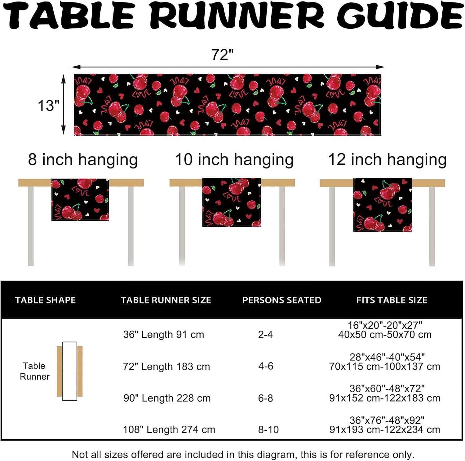 - UNIQUE DESIGNED TABLE RUNNER Our rustic table runner is designed with the current elements to add style and vibrancy to your home. The table runner is printed with vivid cherry and heart patterns, which is the perfect decoration for Valentine's Day. Express your positive attitude to life by decorating your coffee table, dining table, buffet and kitchen with our seasonal table runners in a variety of themes