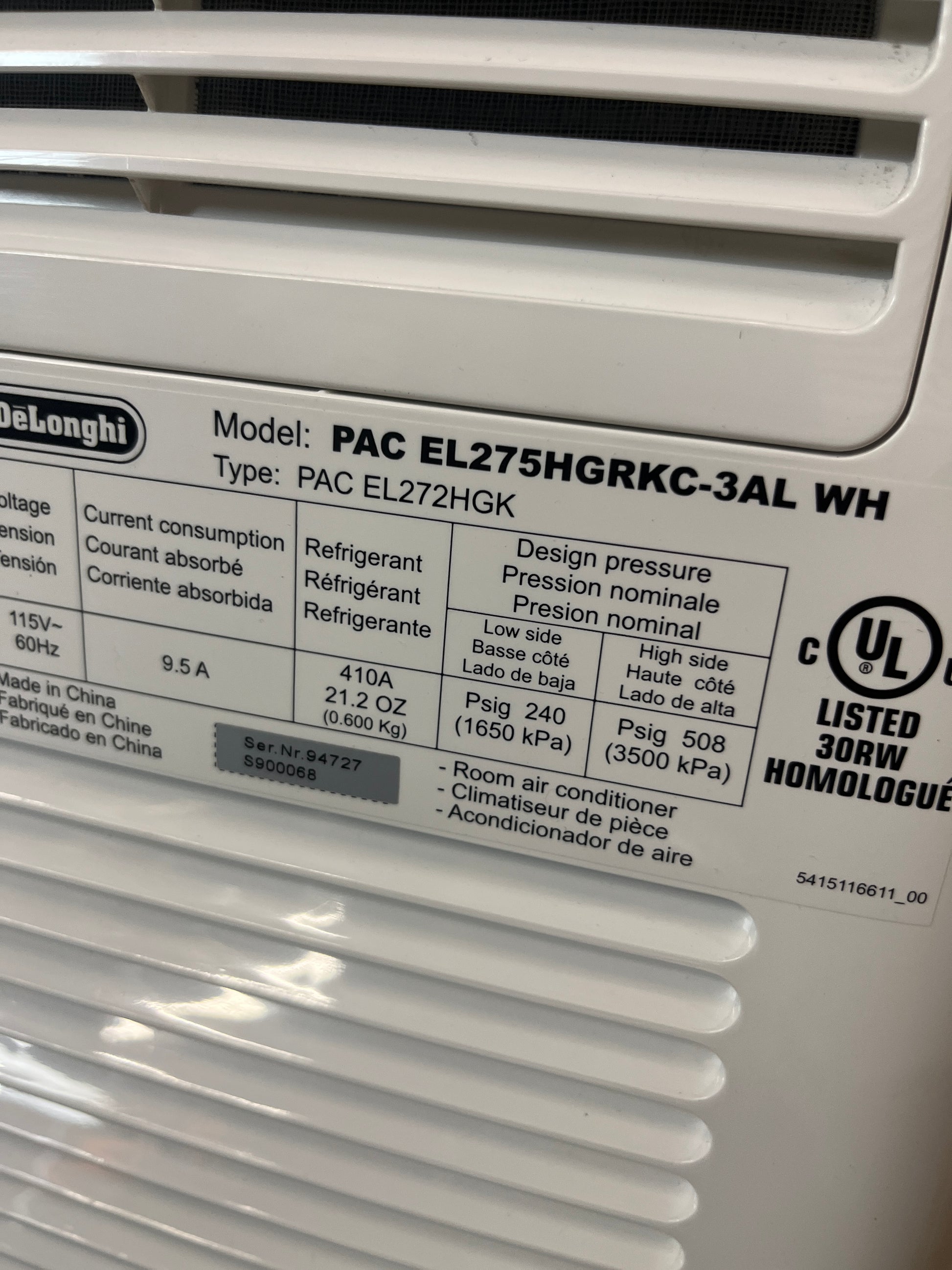 Stay ultra-comfortable with the PAC EL275HGRKC De’Longhi Pinguino Plus 12,000 BTU ASHRAE (7,200 BTU DOE) Portable Air Conditioner plus Heat Option — a powerful 4-in-1 unit with cooling, heating, dehumidifying and fan settings, designed for rooms up to 500 square feet. The ECO Real Feel setting uniquely measures both temperature and humidity, monitoring your surrounding climate to optimize comfort and efficiency while saving up to 30% in energy consumption. Use the handy heat option to take the chill out of cool nights and mornings for true multi-season coziness. Best of all, cool only the room you’re in so you can raise your household thermostat setting and lower your energy bills.