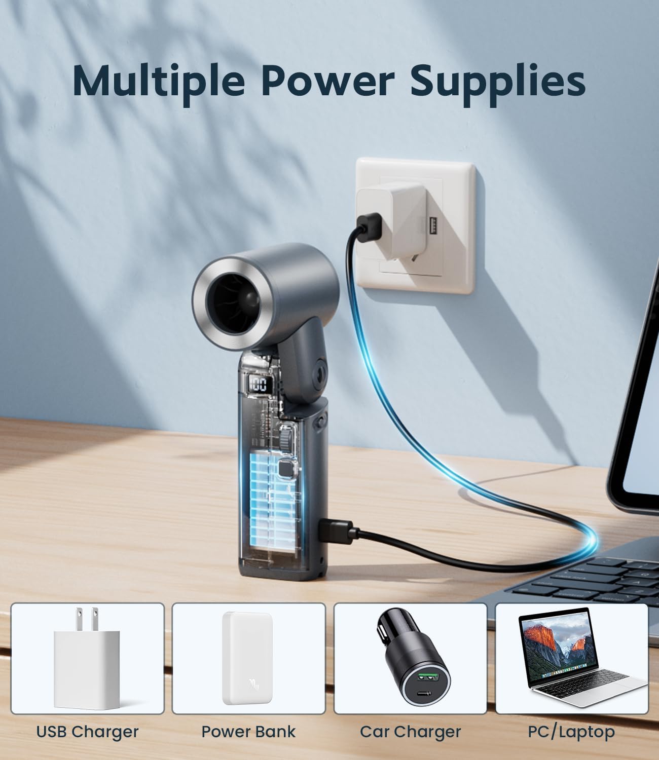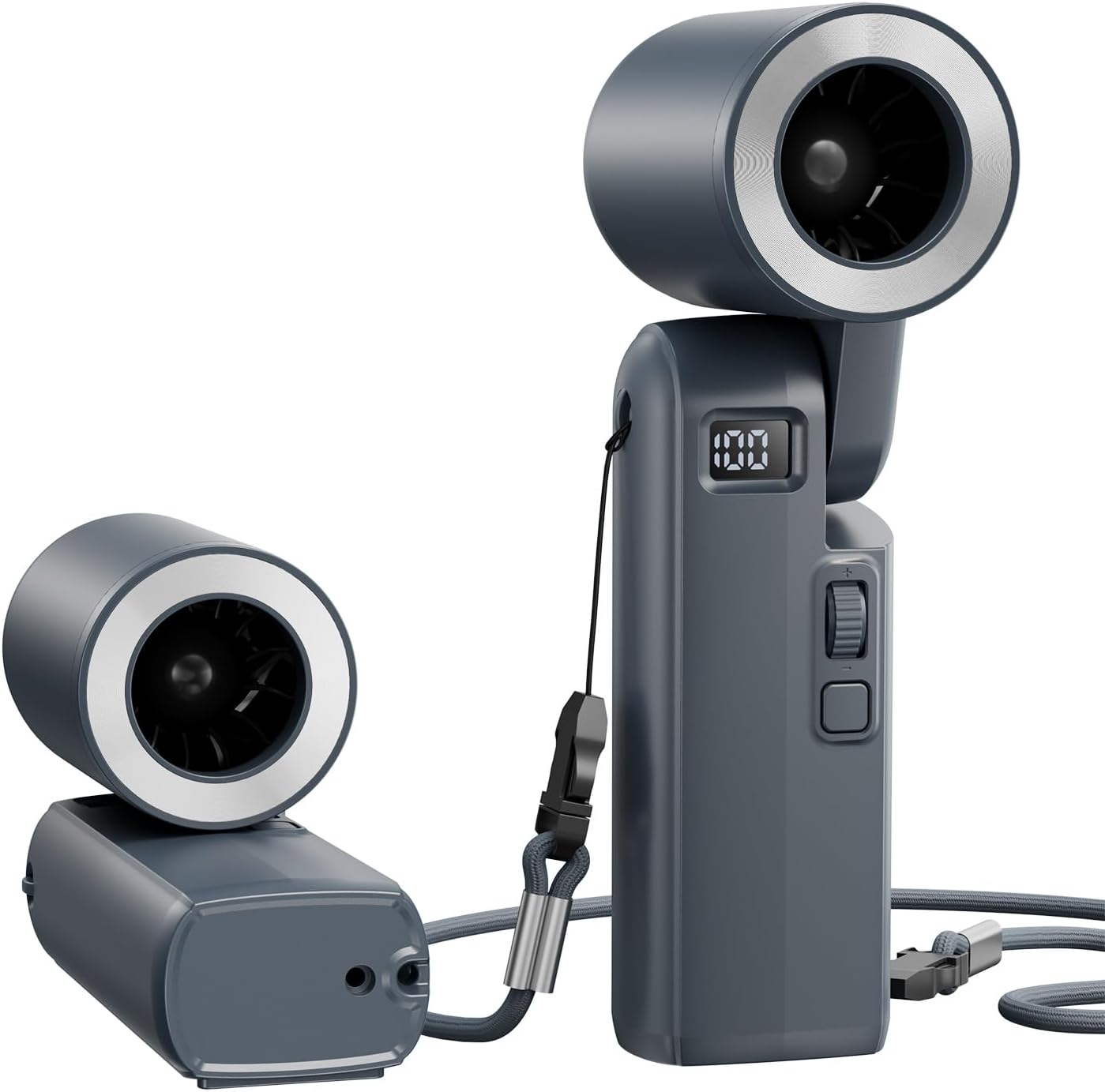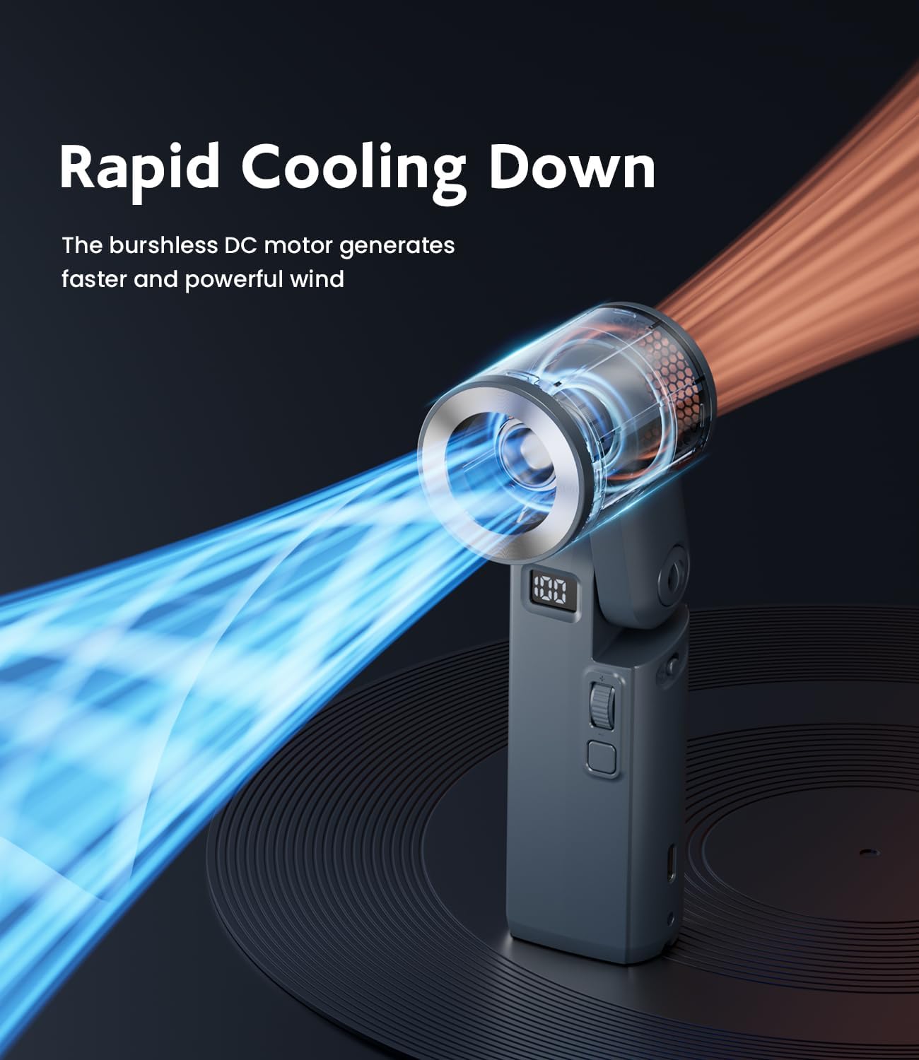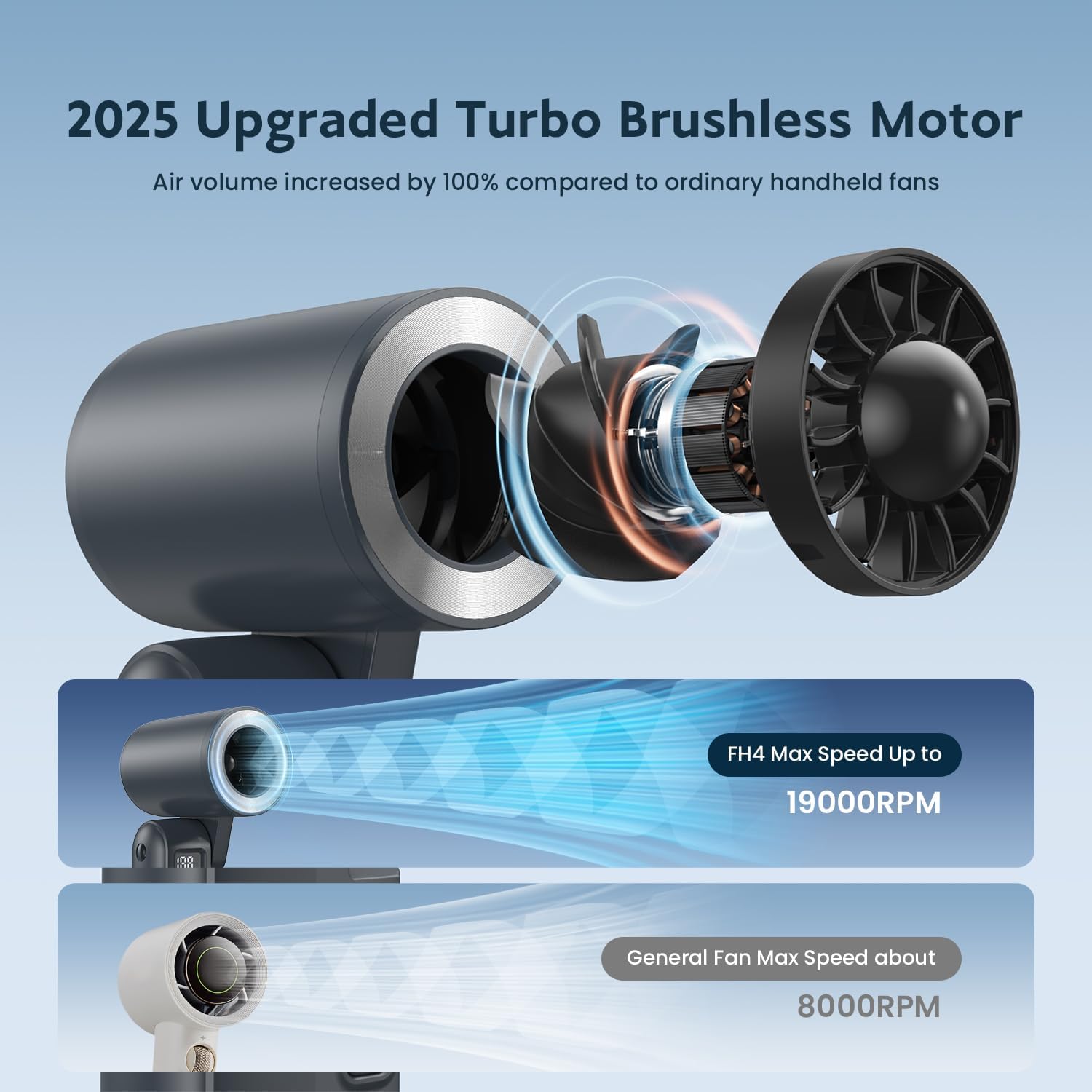 - Technology Design with Brushless Motor: Turbo fan equipped with upgraded burshless motor and advanced 5-blade design, the highest speed of the fan arrives to 9M/S and 19,000RPM per minute, which is 2 times the wind power of ordinary hand fans, brings you a strong and stable wind cooling immediately