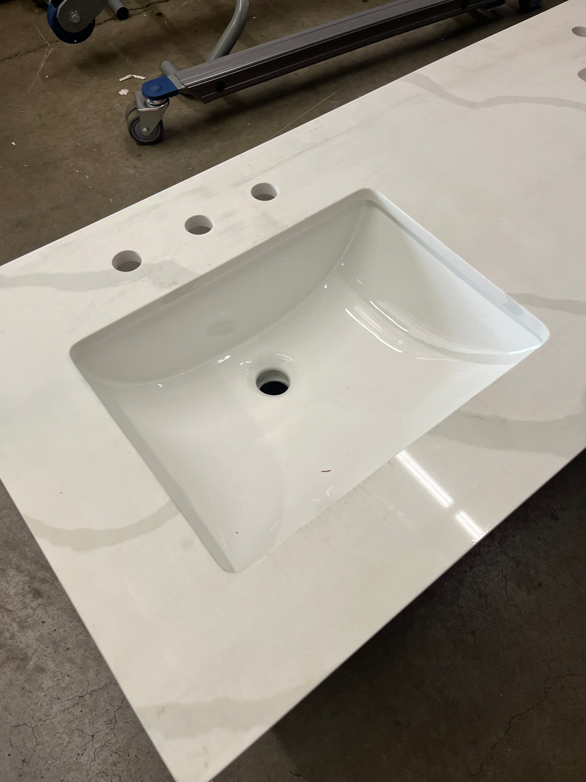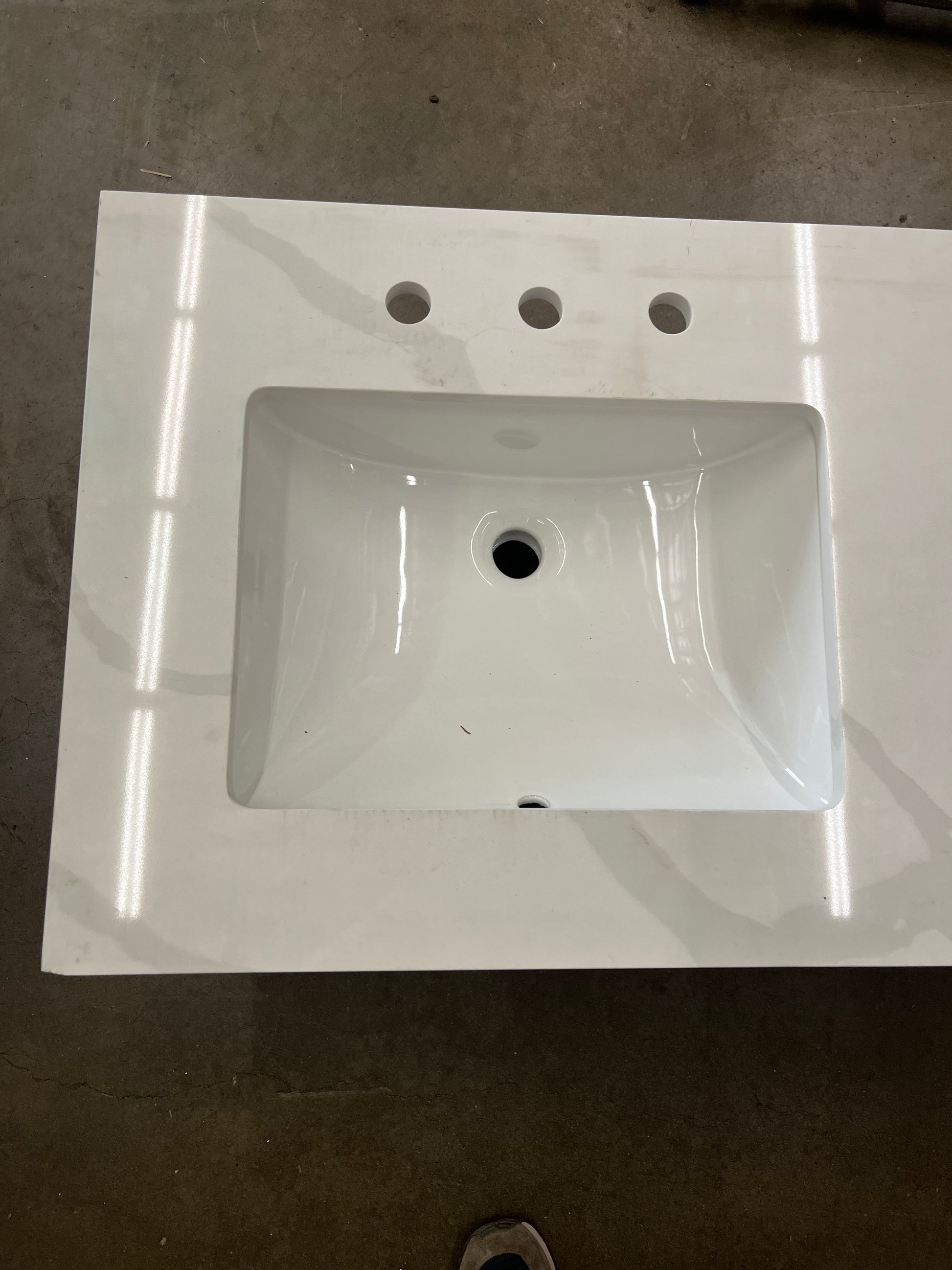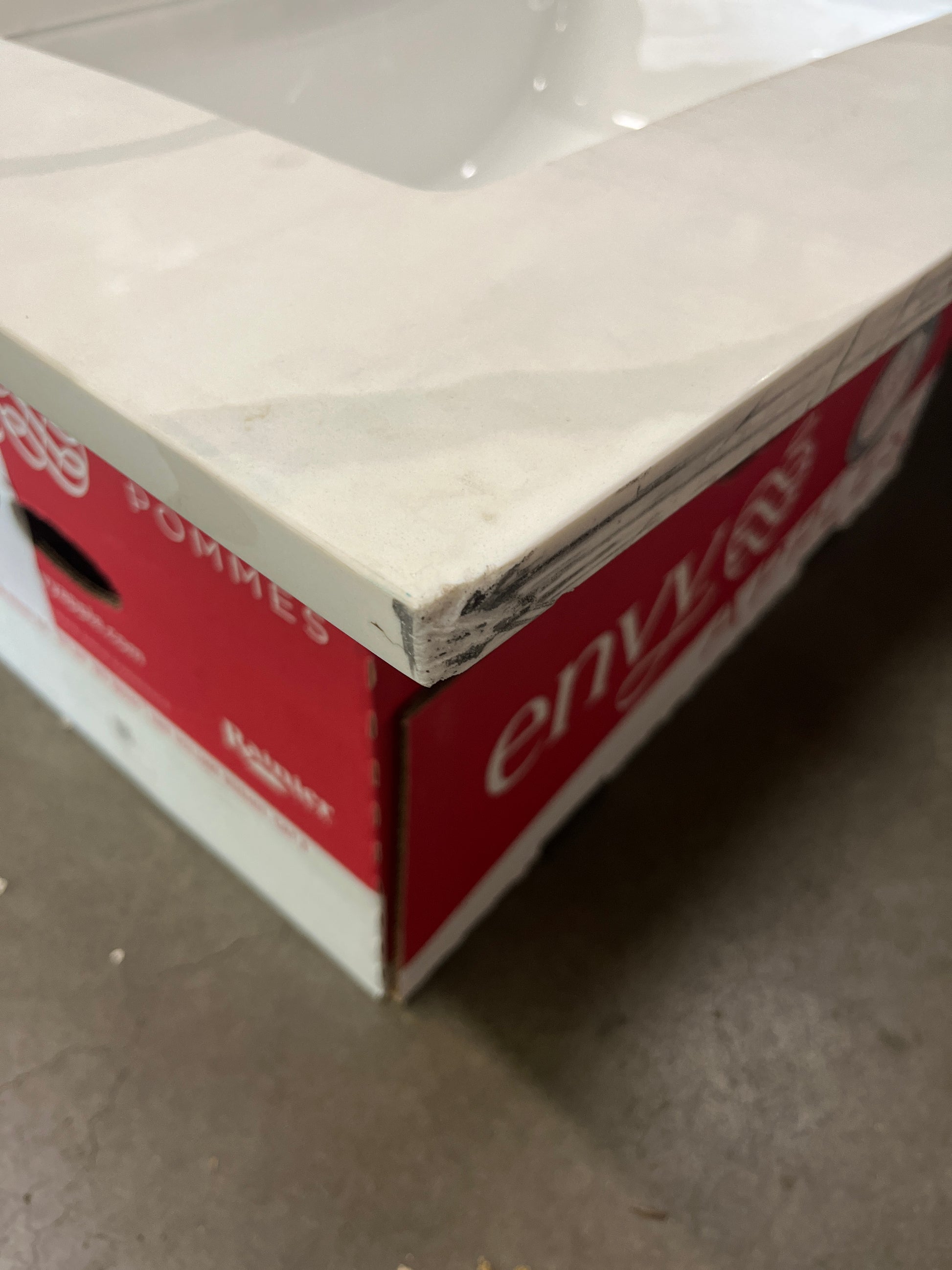 There are a couple of chips on the front edge of the top, on the front left side, and along the front edge towards the middle/right. There are also some black marks on the front edge. Otherwise, the vanity top is in great condition.