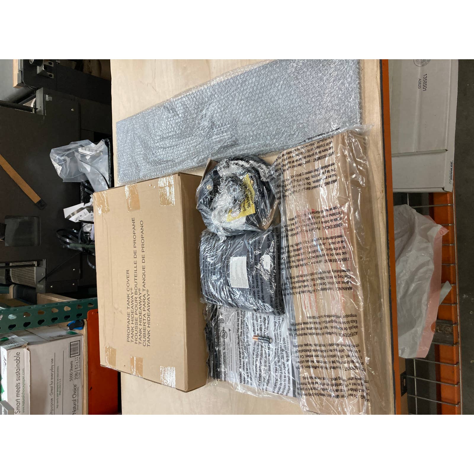 There is minor damage on the left side of the fire pit. Detailed pictures are included. There are a couple of the broken pieces that fit in as well as a touch up pen that is included with the set. Other than the damage it's NEW and includes everything including propane cover.