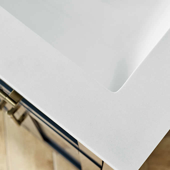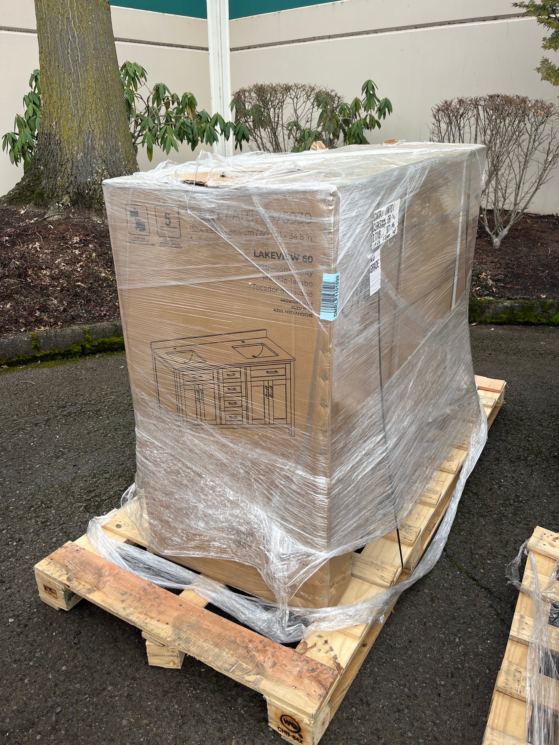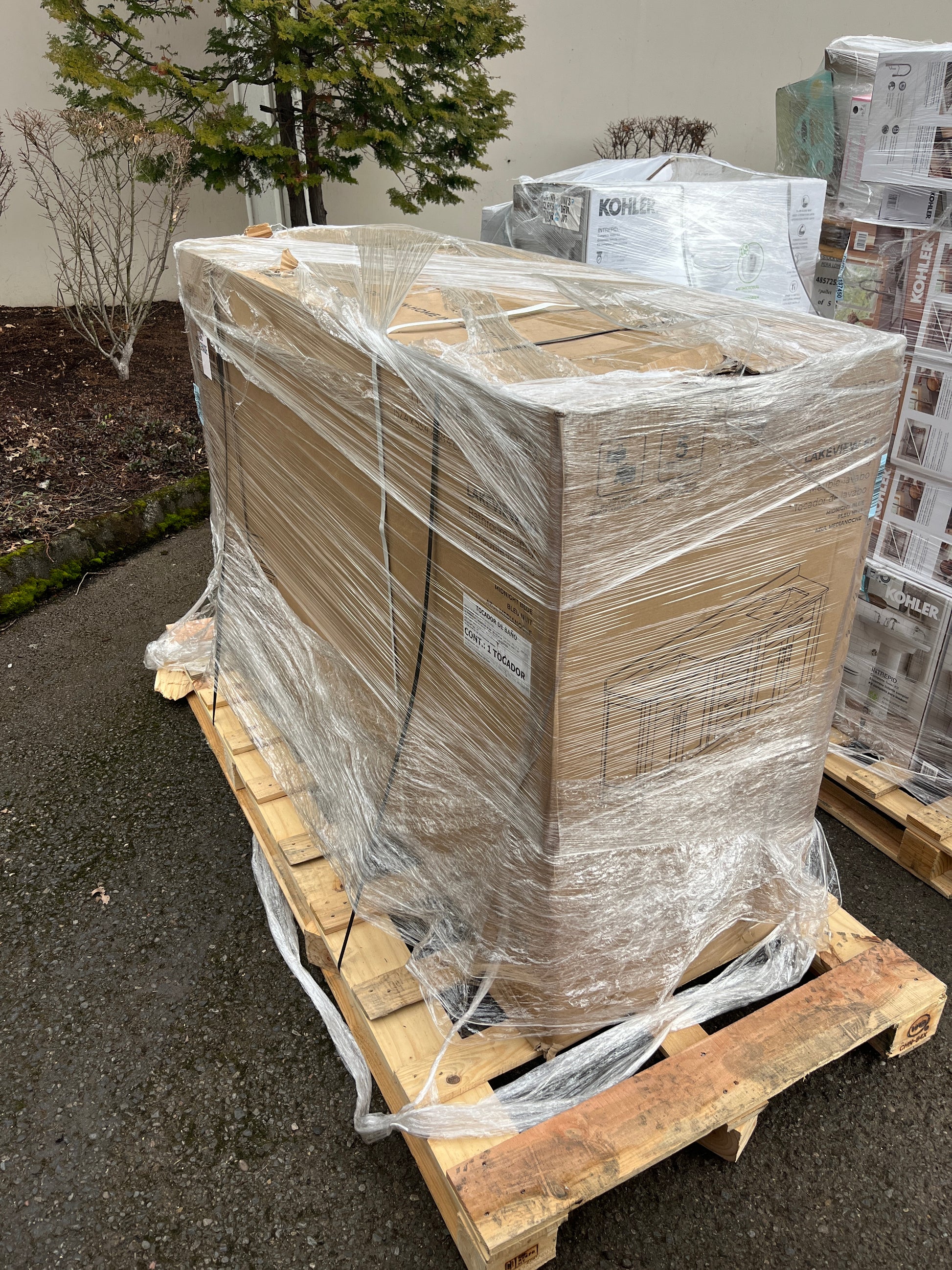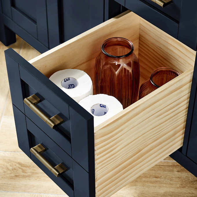 | New in never opened box. Features: Top Drilled for Two Single-Hole Faucets Cultured Stone Countertop Pull-out Shelf with Integrated Power Bar Soft-close Drawers with Adjustable Dividers SKU 3546 |